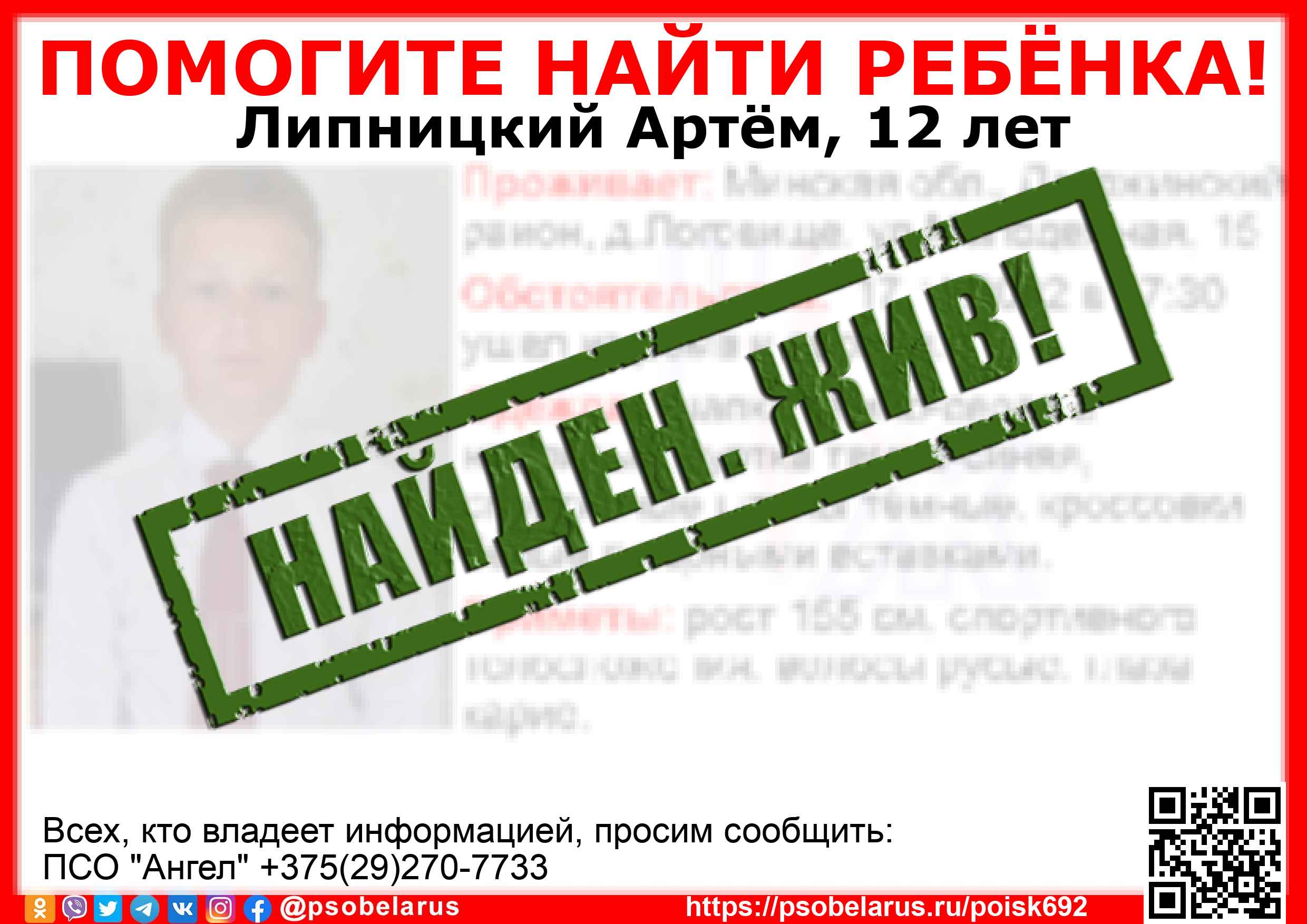 Всех, кто владеет информацией, просим сообщить: ПСО "Ангел" +375(29)270-7733 |