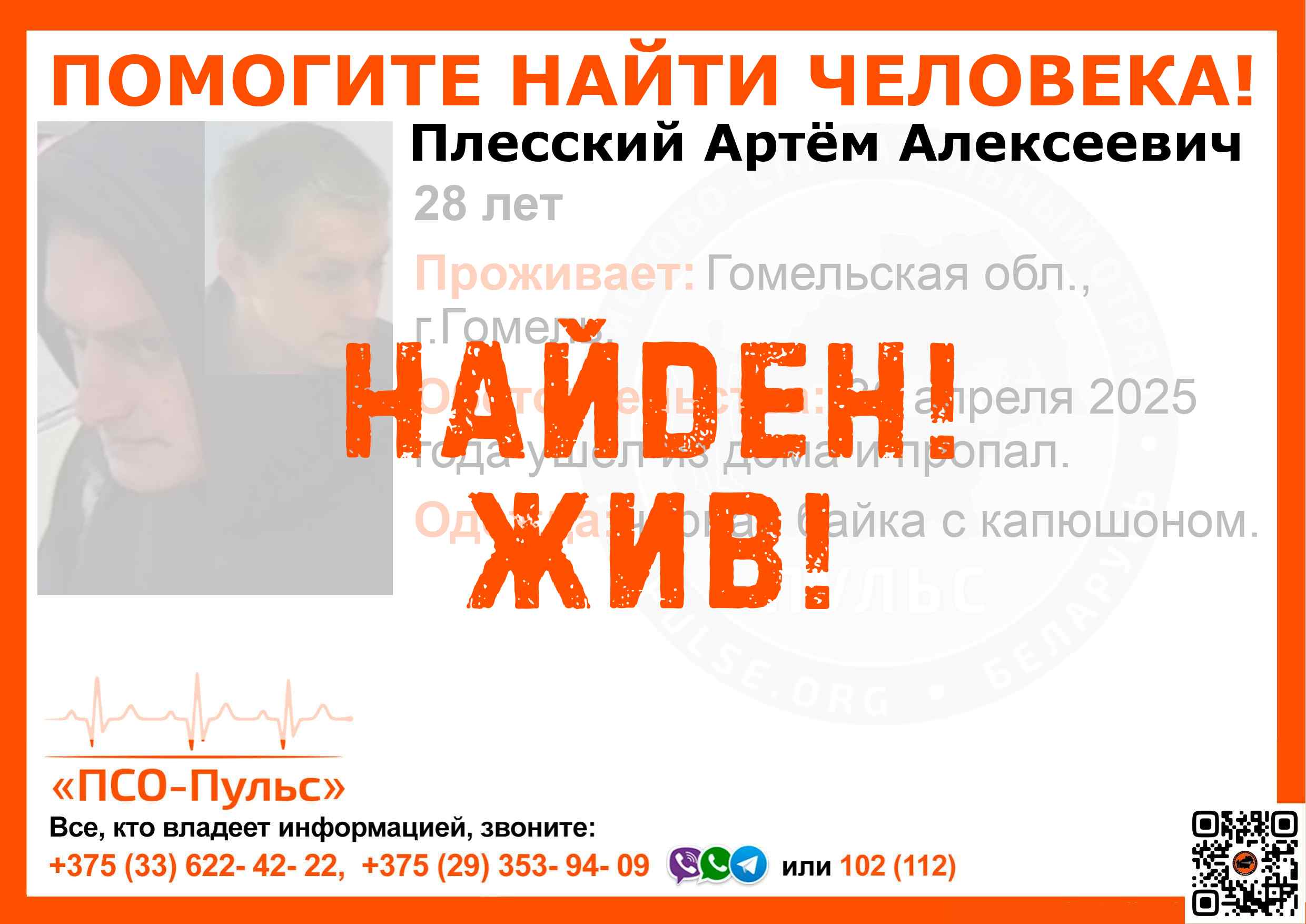 Всех, кто владеет информацией, просим сообщить: ПСО "ПСО-Пульс" +375(33)622-4222 |