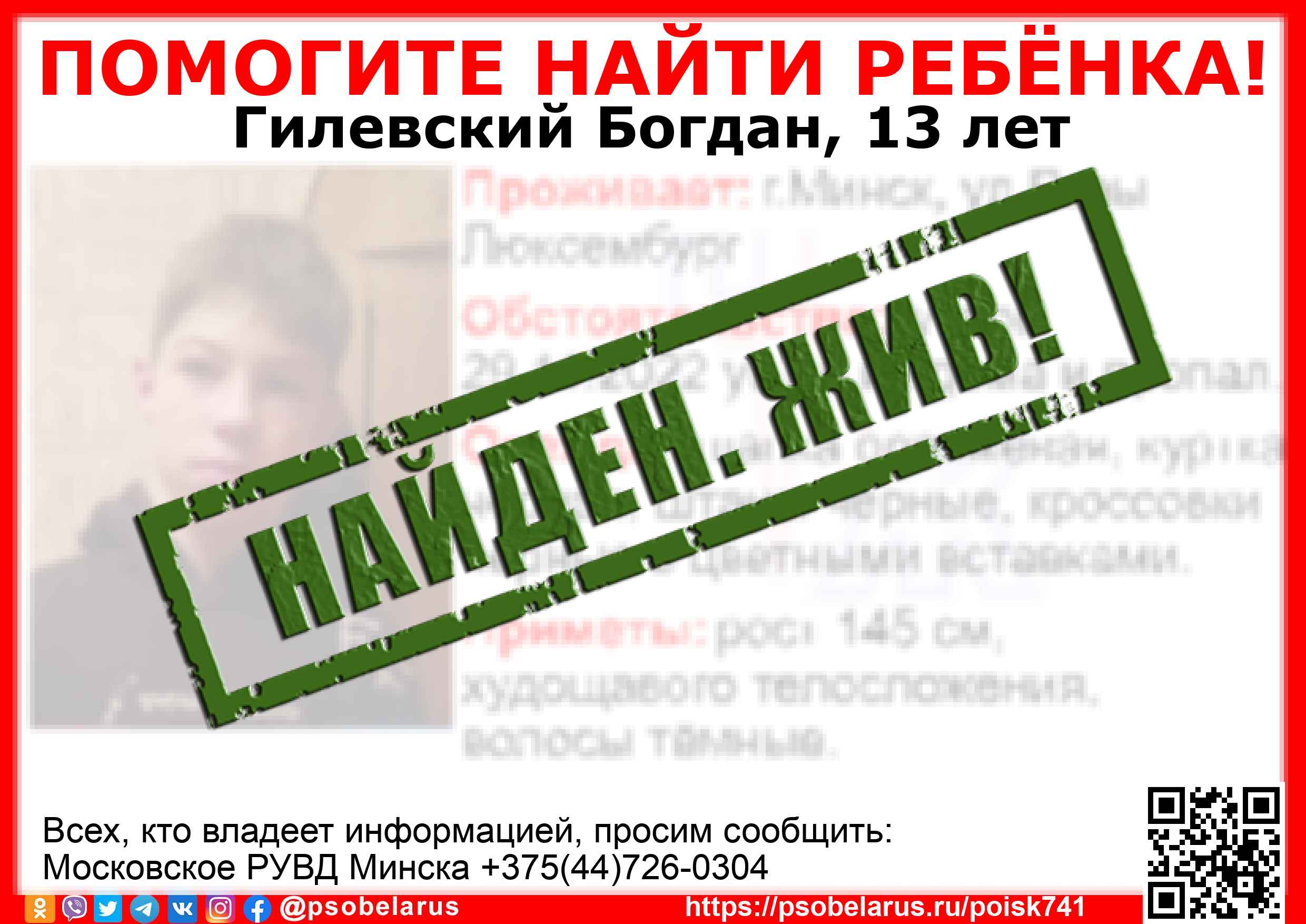Скачать ориентировкуДля оперативного получения информации о пропавших людях и сборах на поиски можно подписаться на бота оповещения: Телеграм