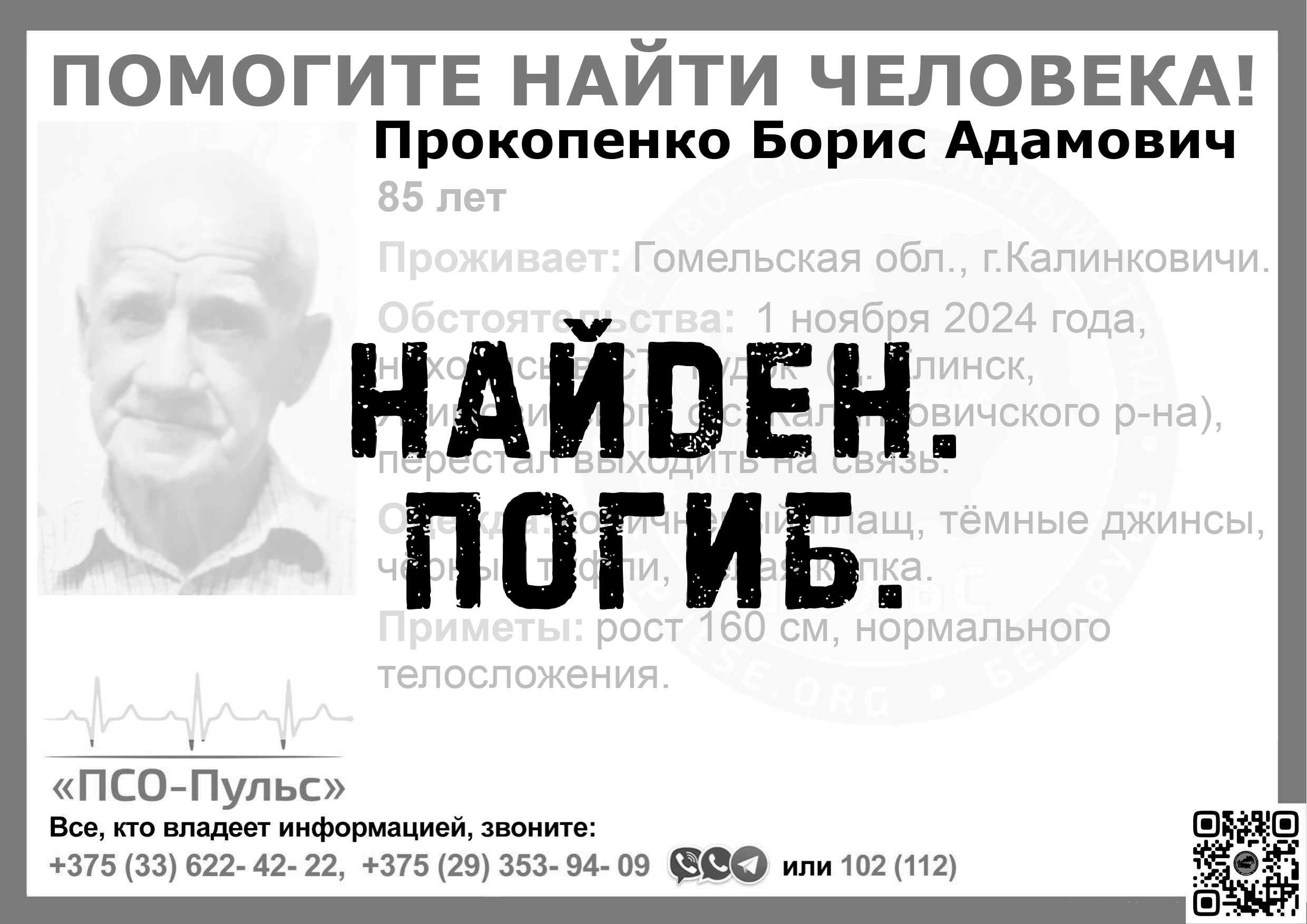 Всех, кто владеет информацией, просим сообщить: ПСО "ПСО-Пульс" +375(33)622-4222 |