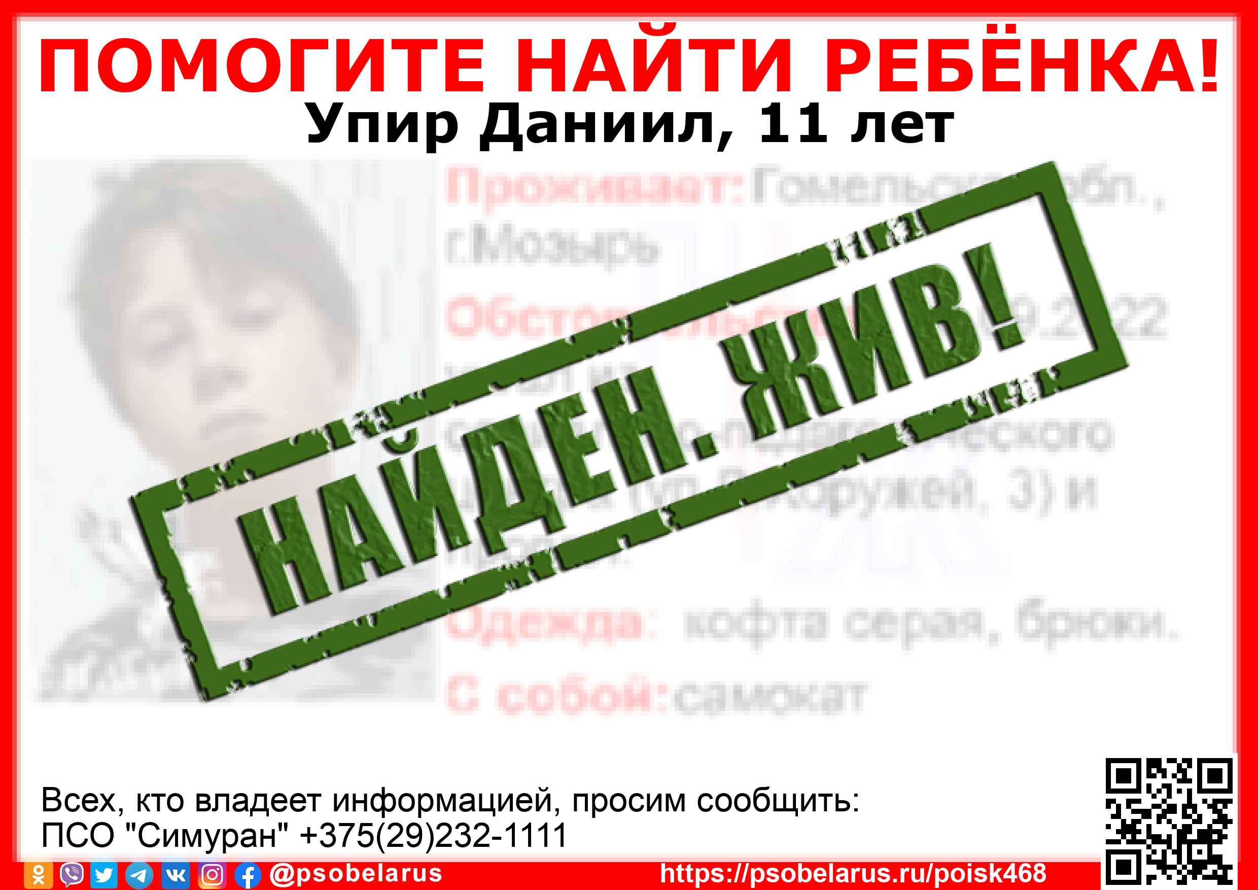| Всех, кто владеет информацией, просим сообщить: ПСО "Симуран" +375(29)232-1111 |  |