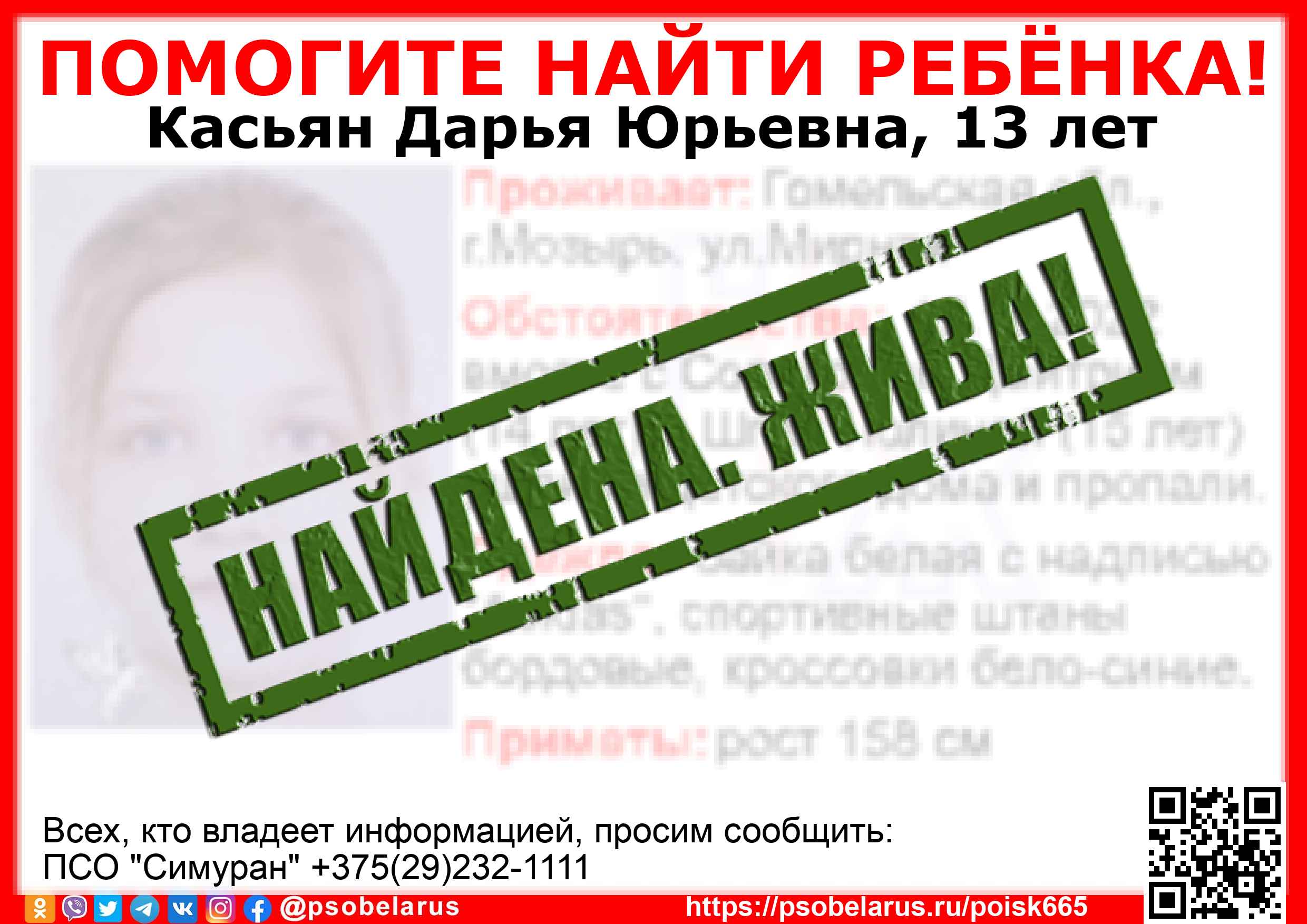 Всех, кто владеет информацией, просим сообщить: ПСО "Симуран" +375(29)232-1111 |