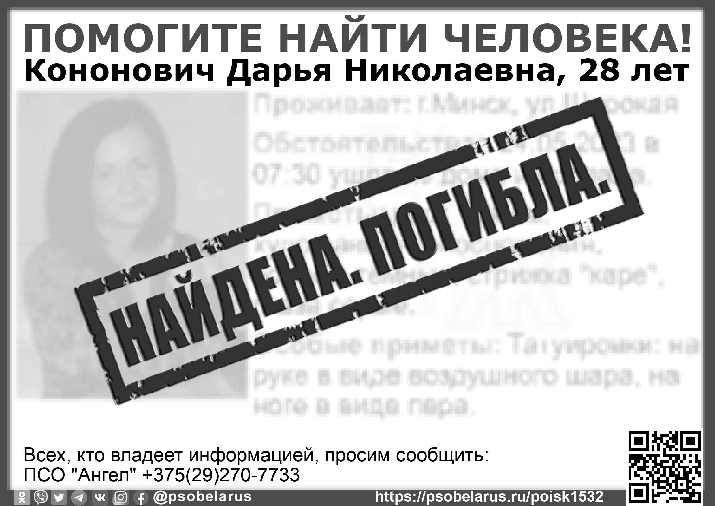 Всех, кто владеет информацией, просим сообщить: ПСО "Ангел" +375(29)270-7733 |