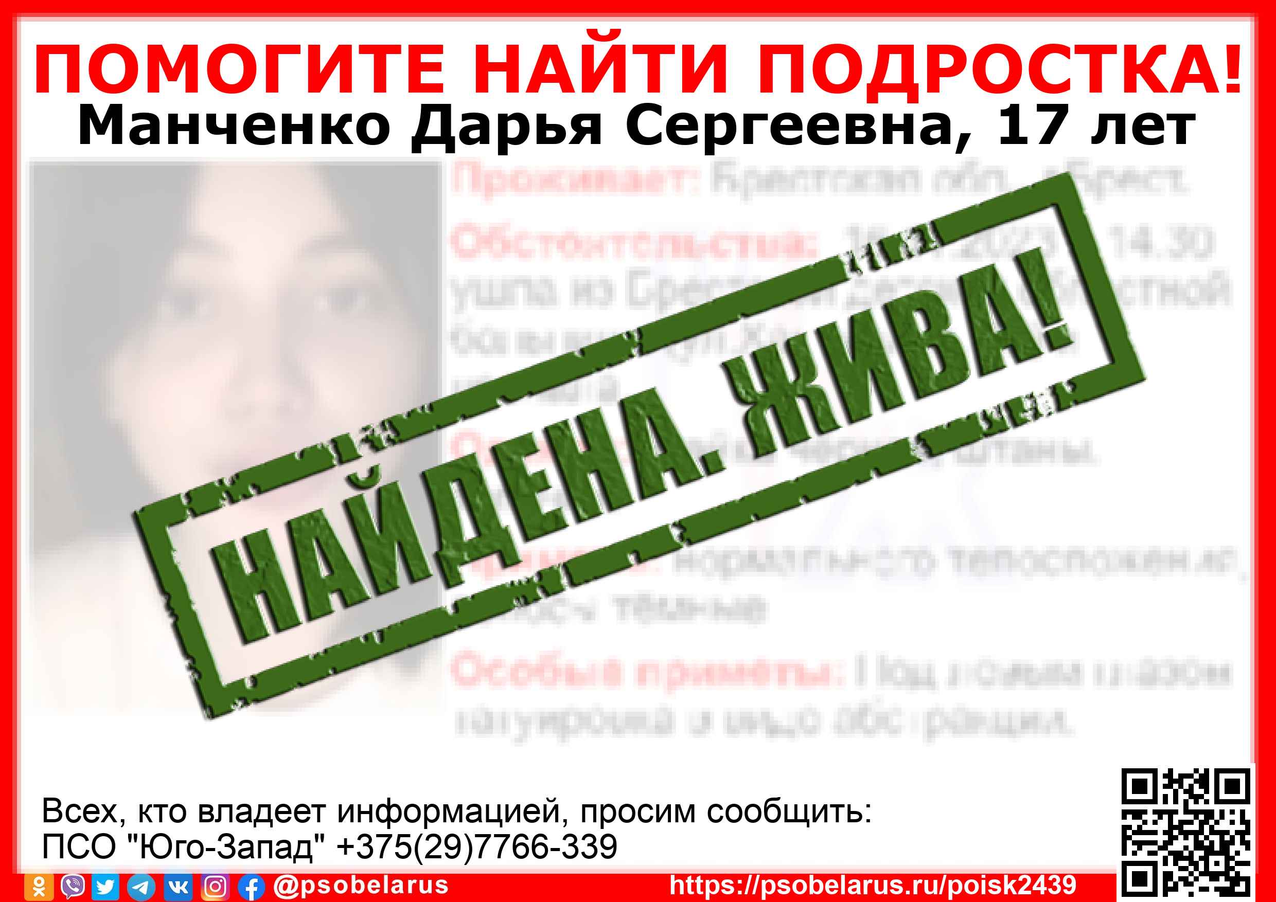 Всех, кто владеет информацией, просим сообщить: ПСО "Юго-Запад" +375(29)7766-339 |