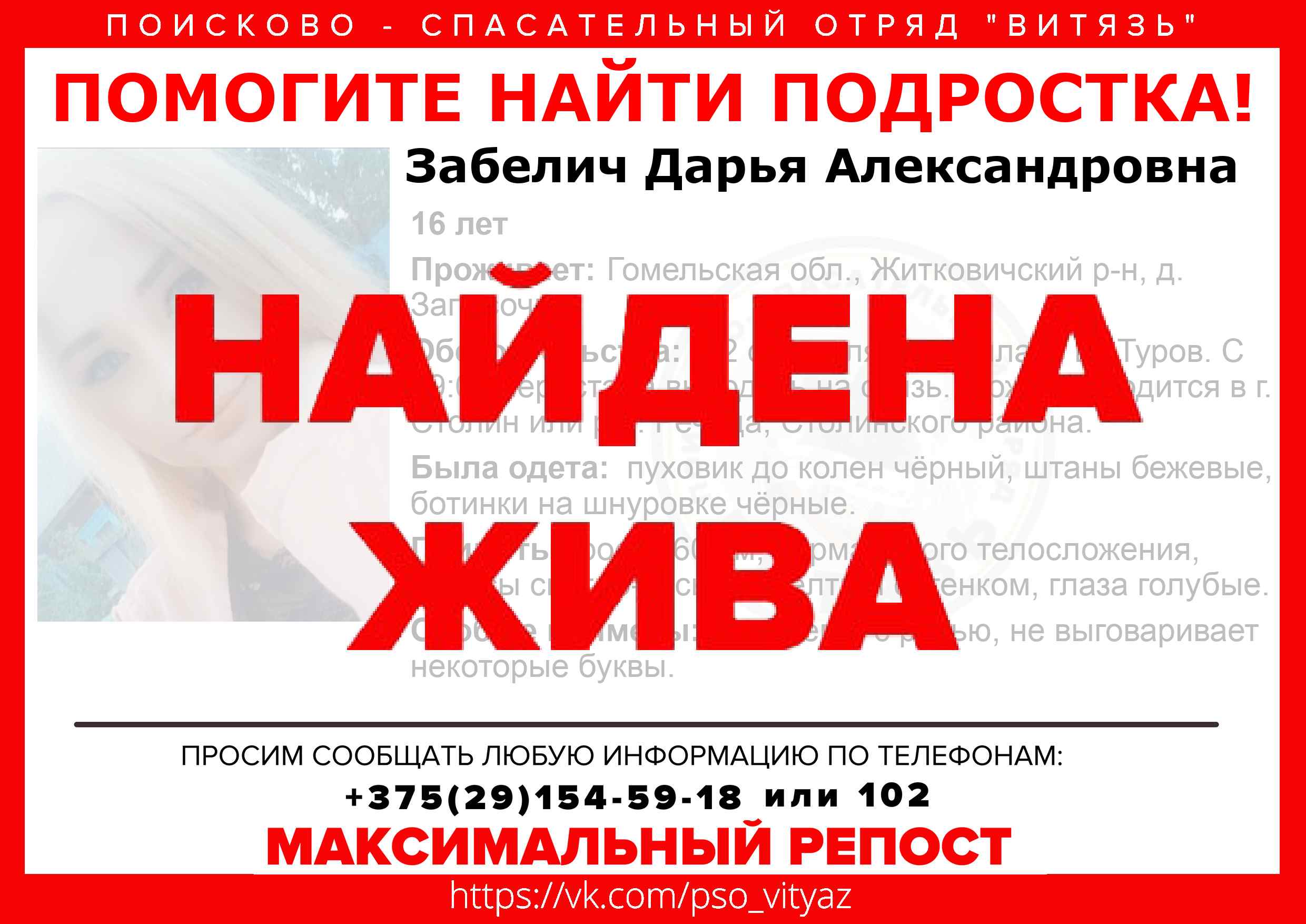 Всех, кто владеет информацией, просим сообщить: ПСО "ВИТЯЗЬ" +375(29)154-59-18 |
