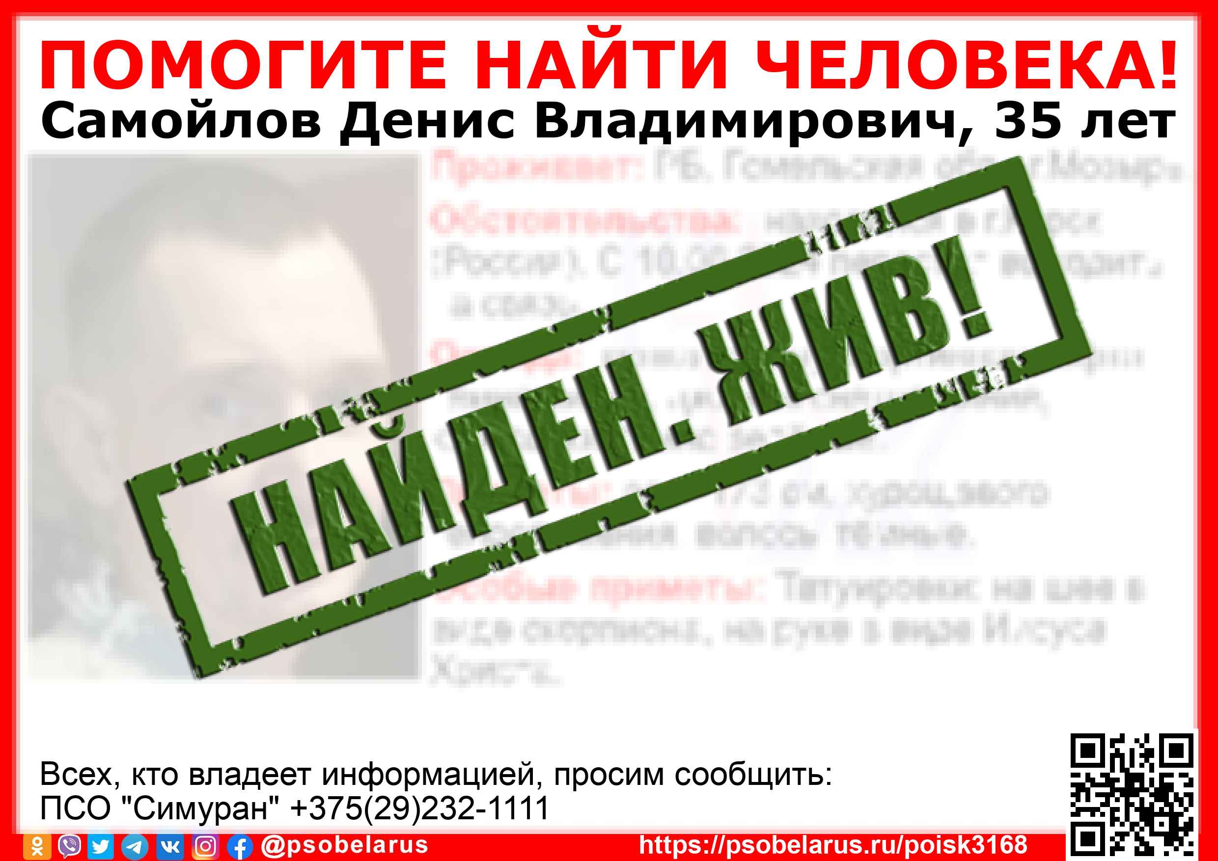 Всех, кто владеет информацией, просим сообщить: ПСО "Симуран" +375(29)232-1111 |