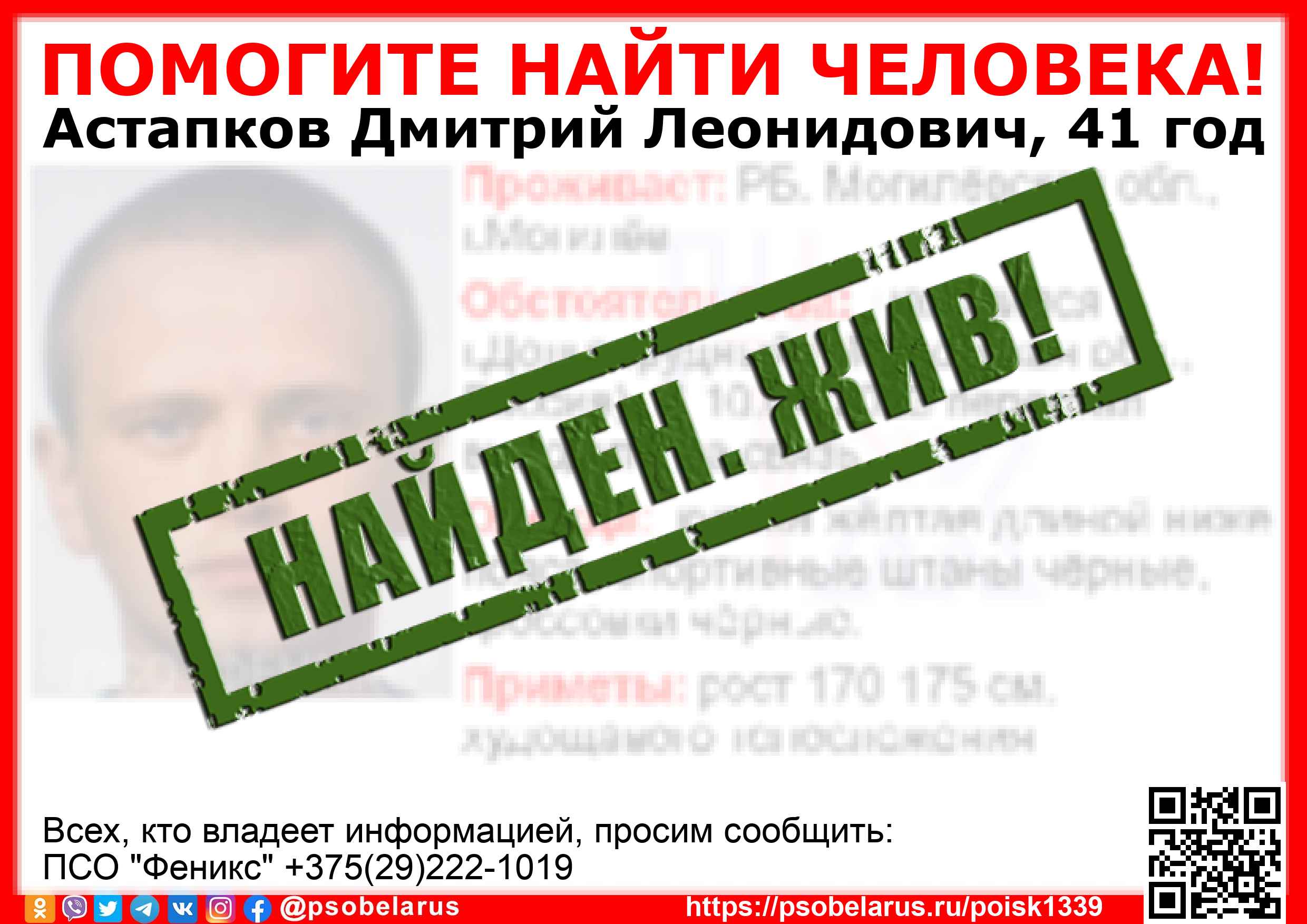 Всех, кто владеет информацией, просим сообщить: ПСО "Феникс" +375(29)222-1019 |