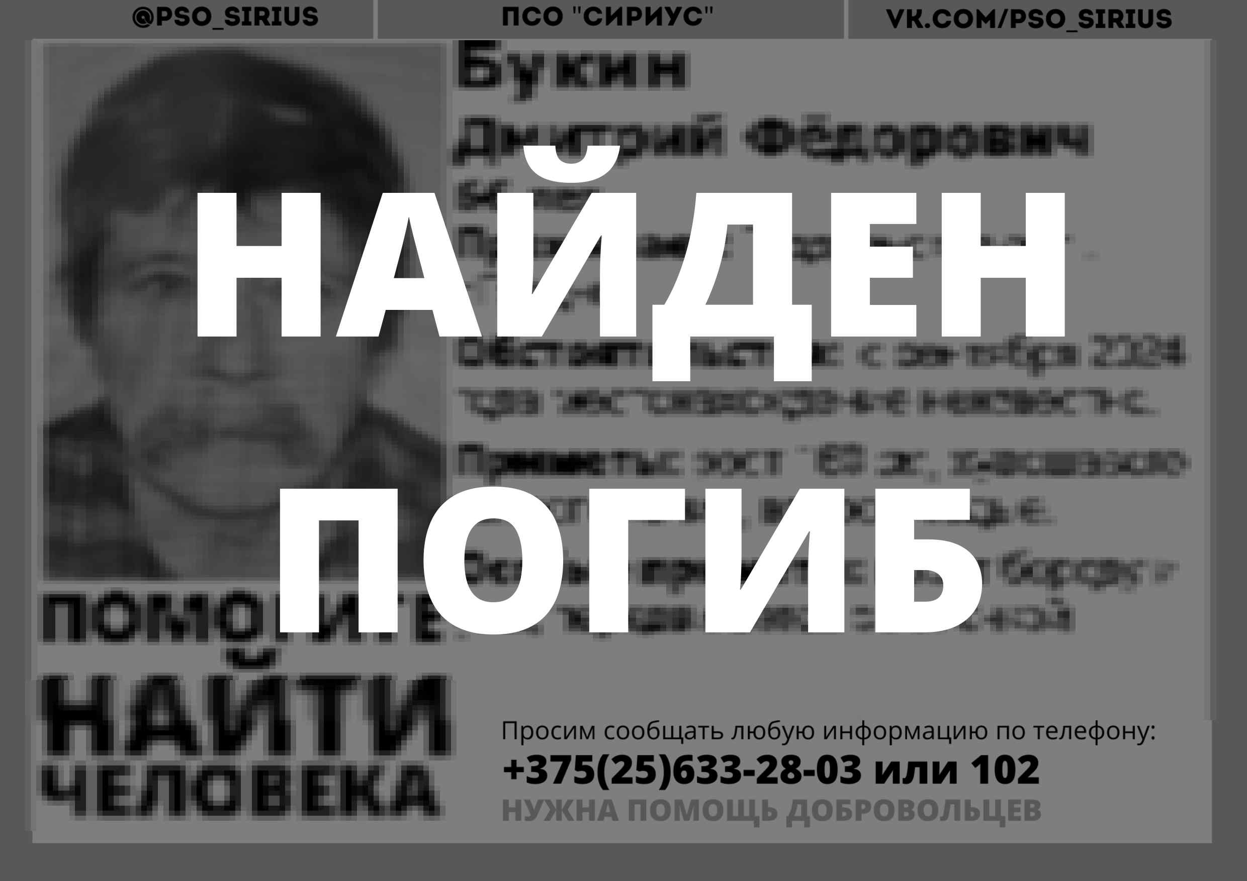 Всех, кто владеет информацией, просим сообщить: ПСО "Сириус" +375(25)633-28-03 |