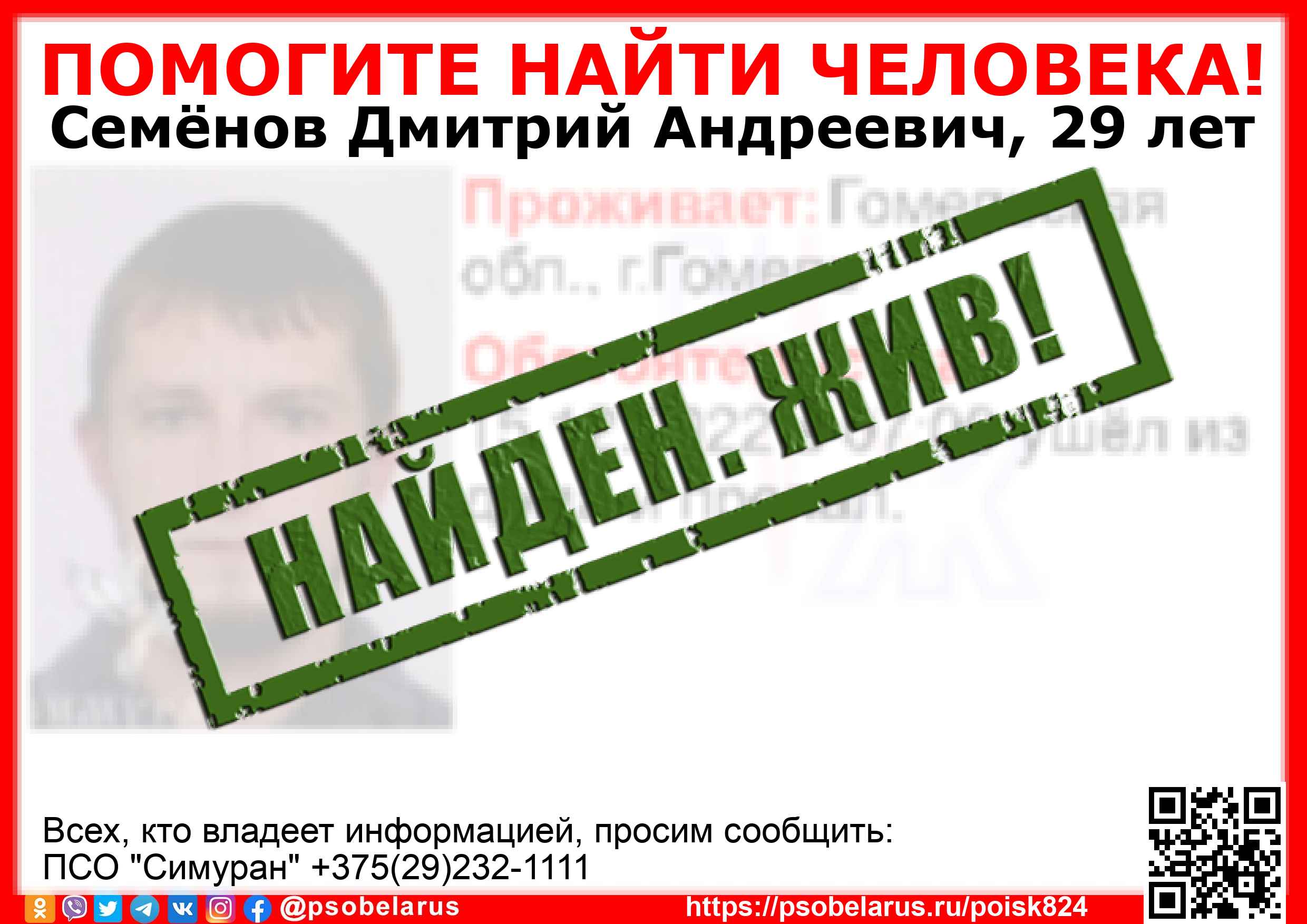 Всех, кто владеет информацией, просим сообщить: ПСО "Симуран" +375(29)232-1111 |