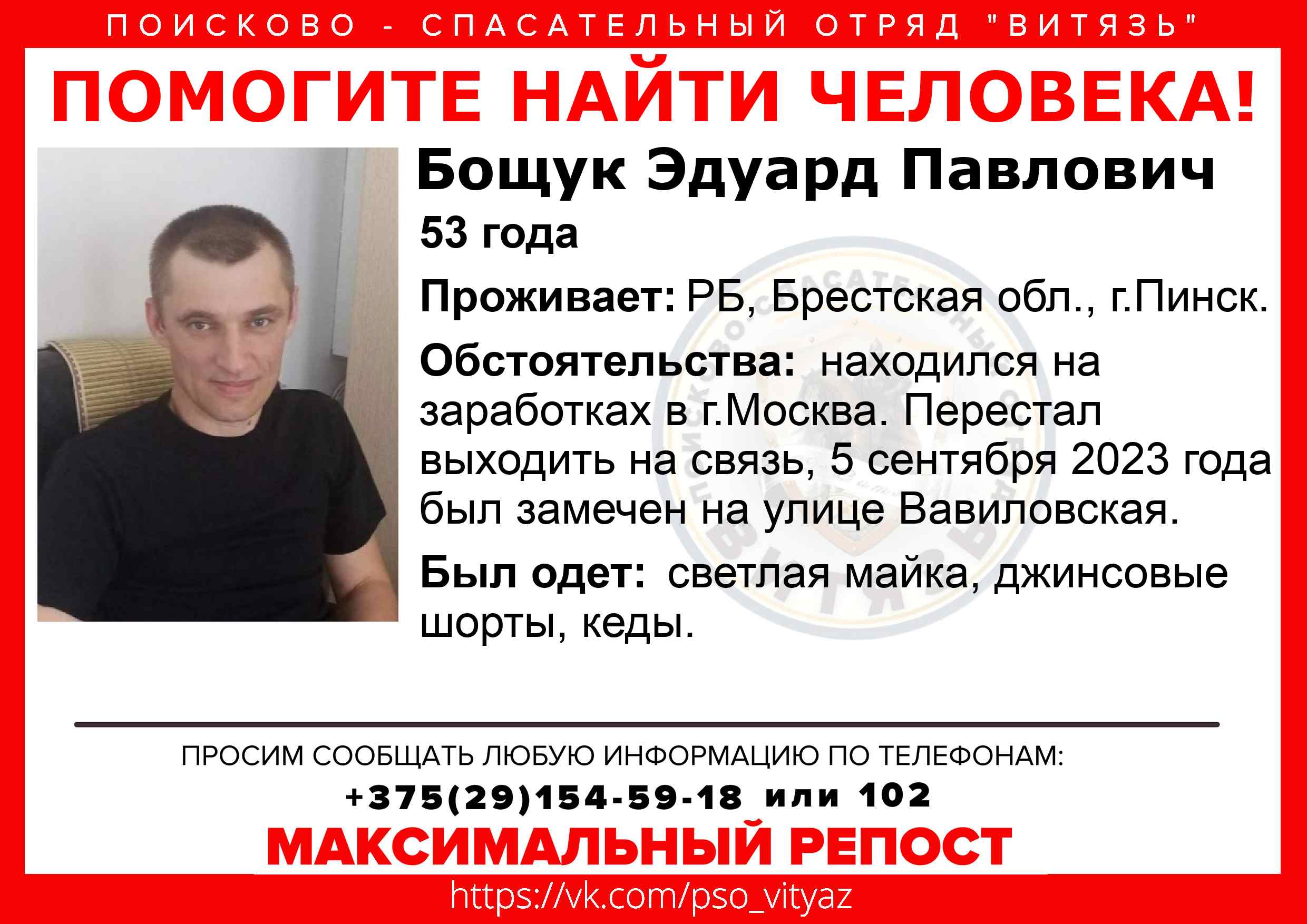 Всех, кто владеет информацией, просим сообщить: ПСО "ВИТЯЗЬ" +375(29)154-59-18 |