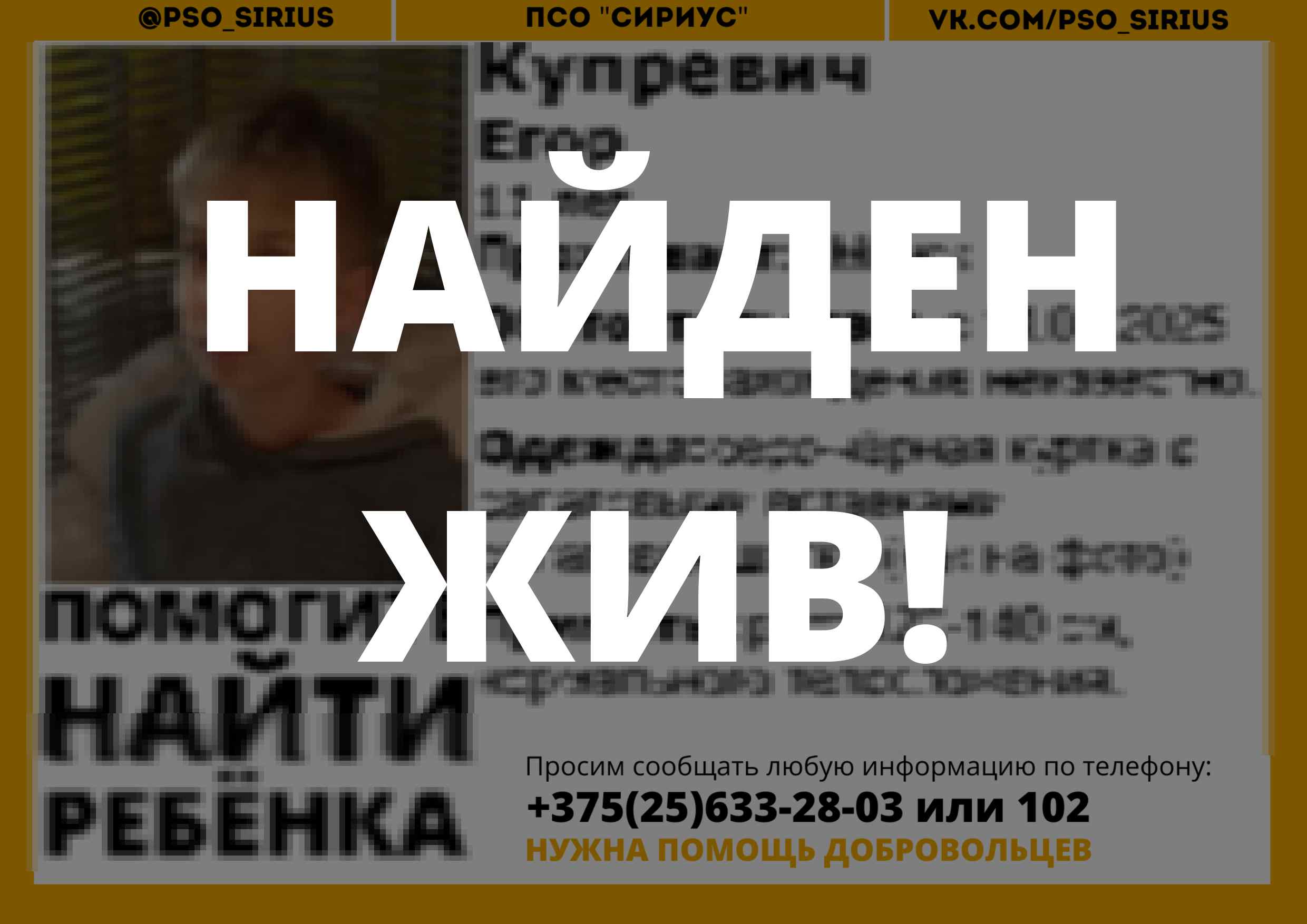 Всех, кто владеет информацией, просим сообщить: ПСО "Сириус" +375(25)633-28-03 |