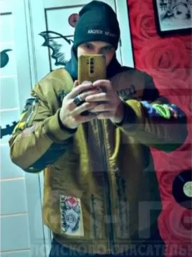 шапка-ушанка чёрная, куртка коричневая, кофта чёрная с рисунком дракона на спине, штаны серые, кроссовки бело-синие.