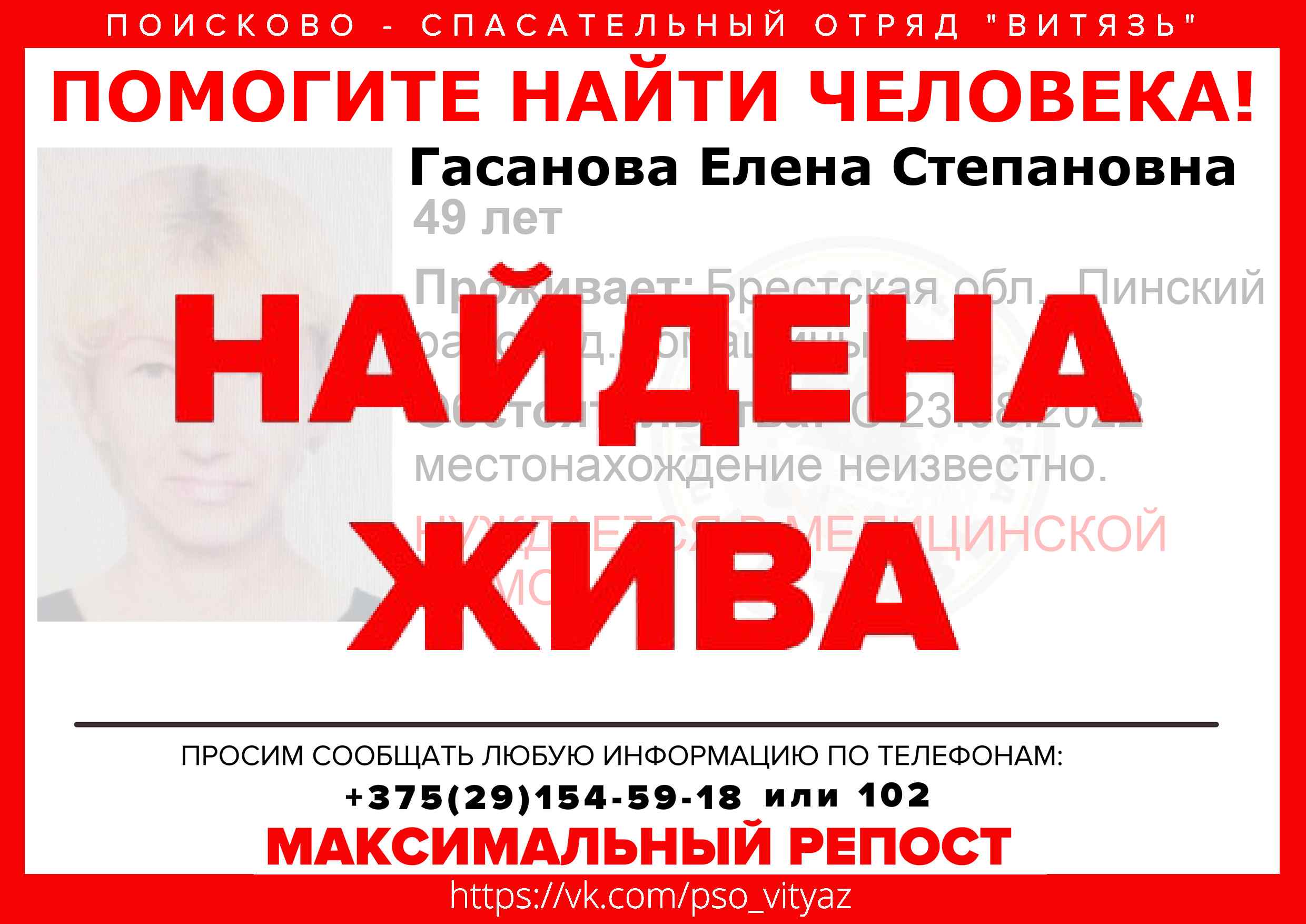 Всех, кто владеет информацией, просим сообщить: ПСО "ВИТЯЗЬ" +375(29)154-59-18 |