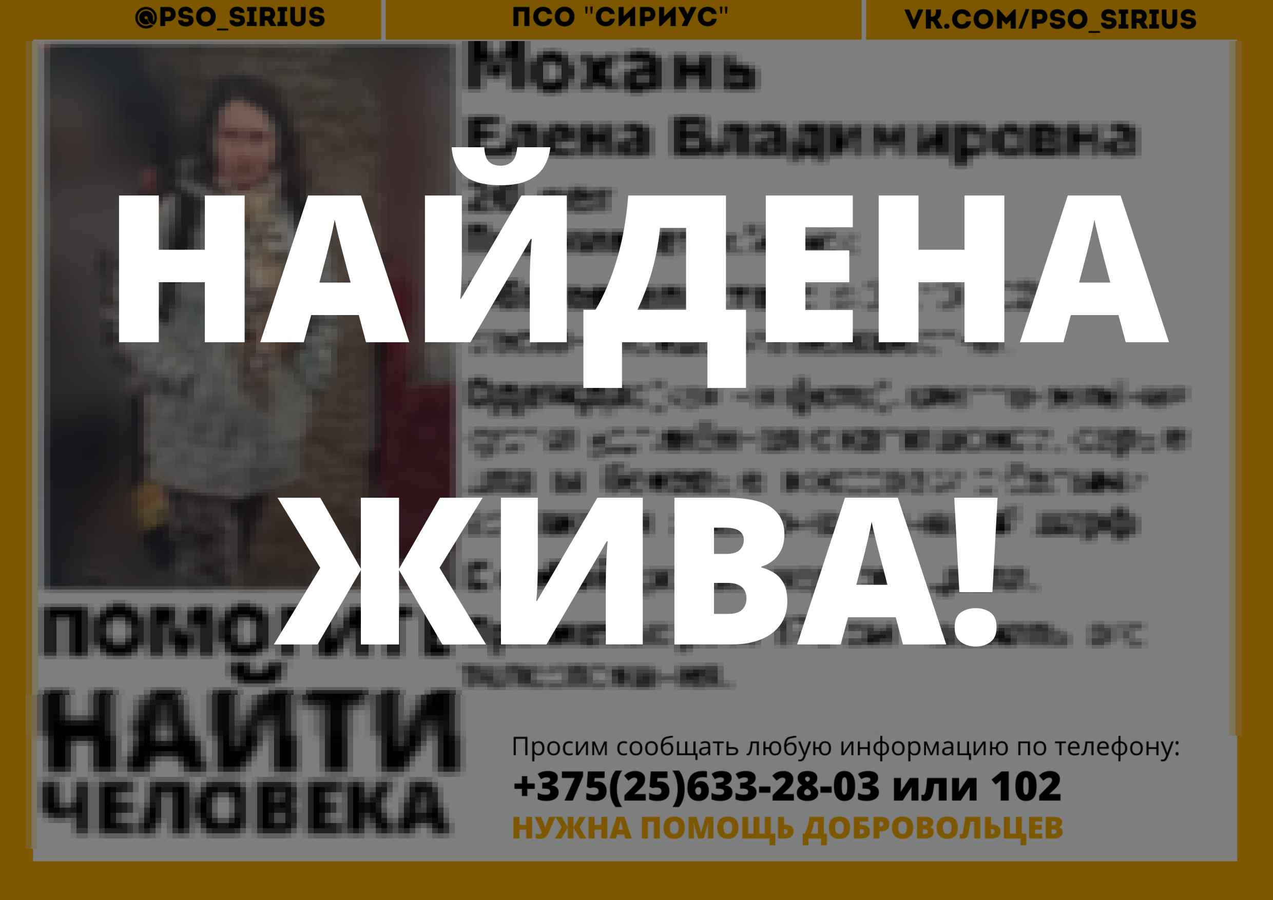 Всех, кто владеет информацией, просим сообщить: ПСО "Сириус" +375(25)633-28-03 |