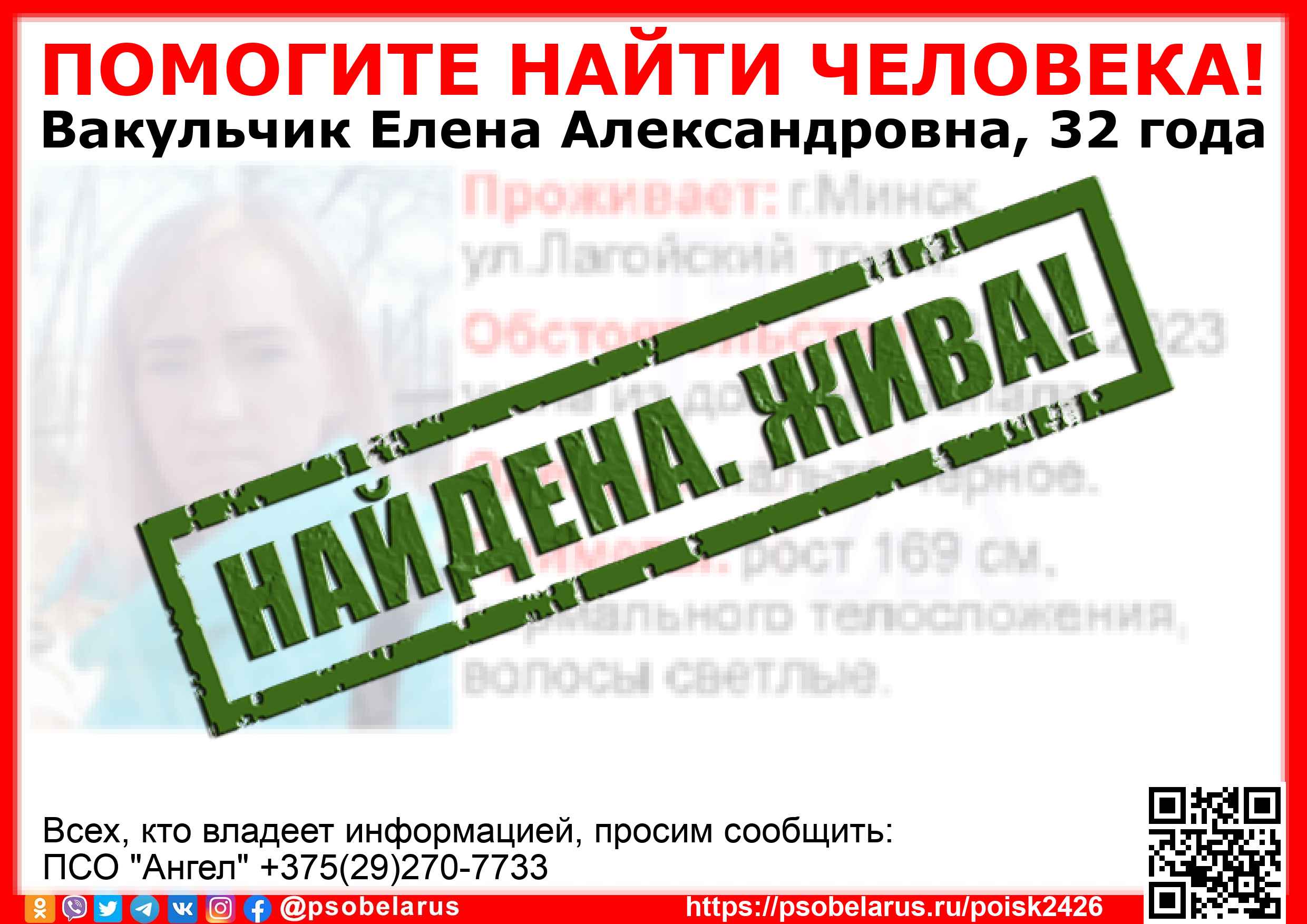 Всех, кто владеет информацией, просим сообщить: ПСО "Ангел" +375(29)270-7733 |