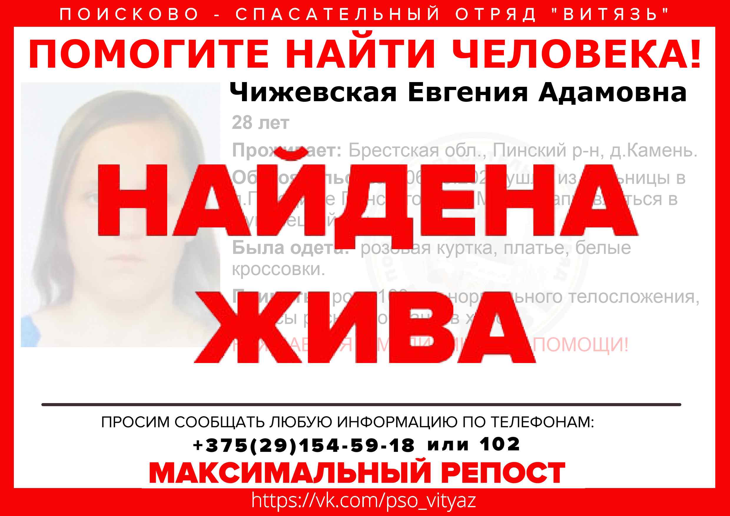 Всех, кто владеет информацией, просим сообщить: ПСО "ВИТЯЗЬ" +375(29)154-59-18 |