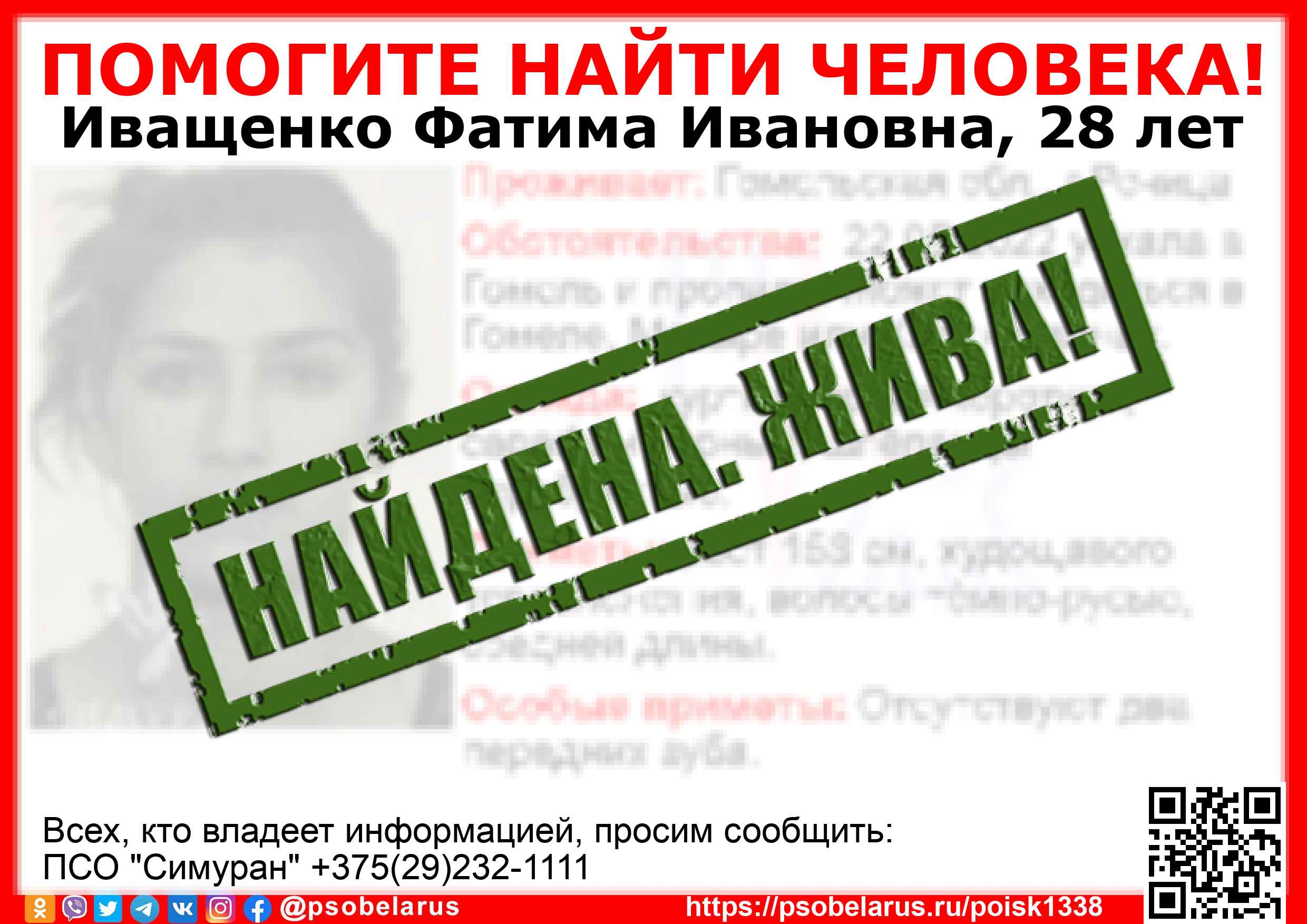 Всех, кто владеет информацией, просим сообщить: ПСО "Симуран" +375(29)232-1111 |