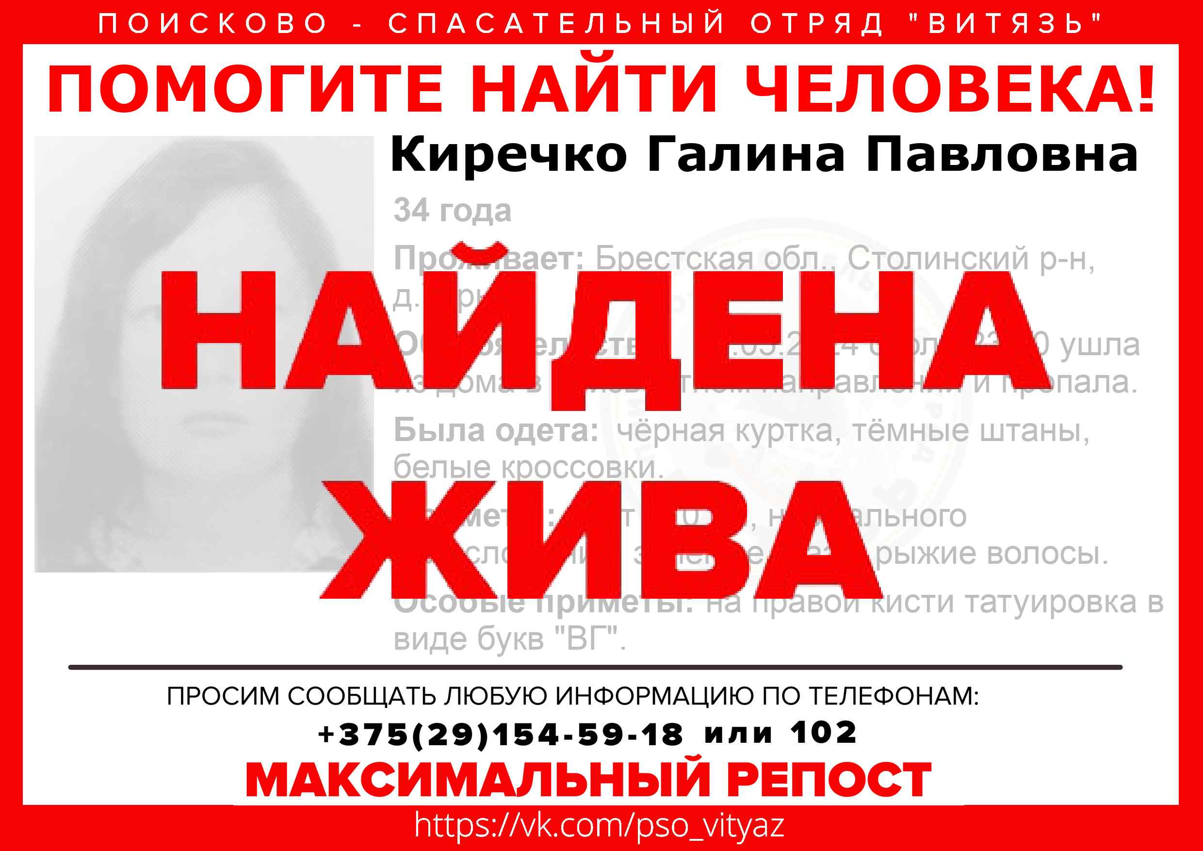 Всех, кто владеет информацией, просим сообщить: ПСО "ВИТЯЗЬ" +375(29)154-59-18 |