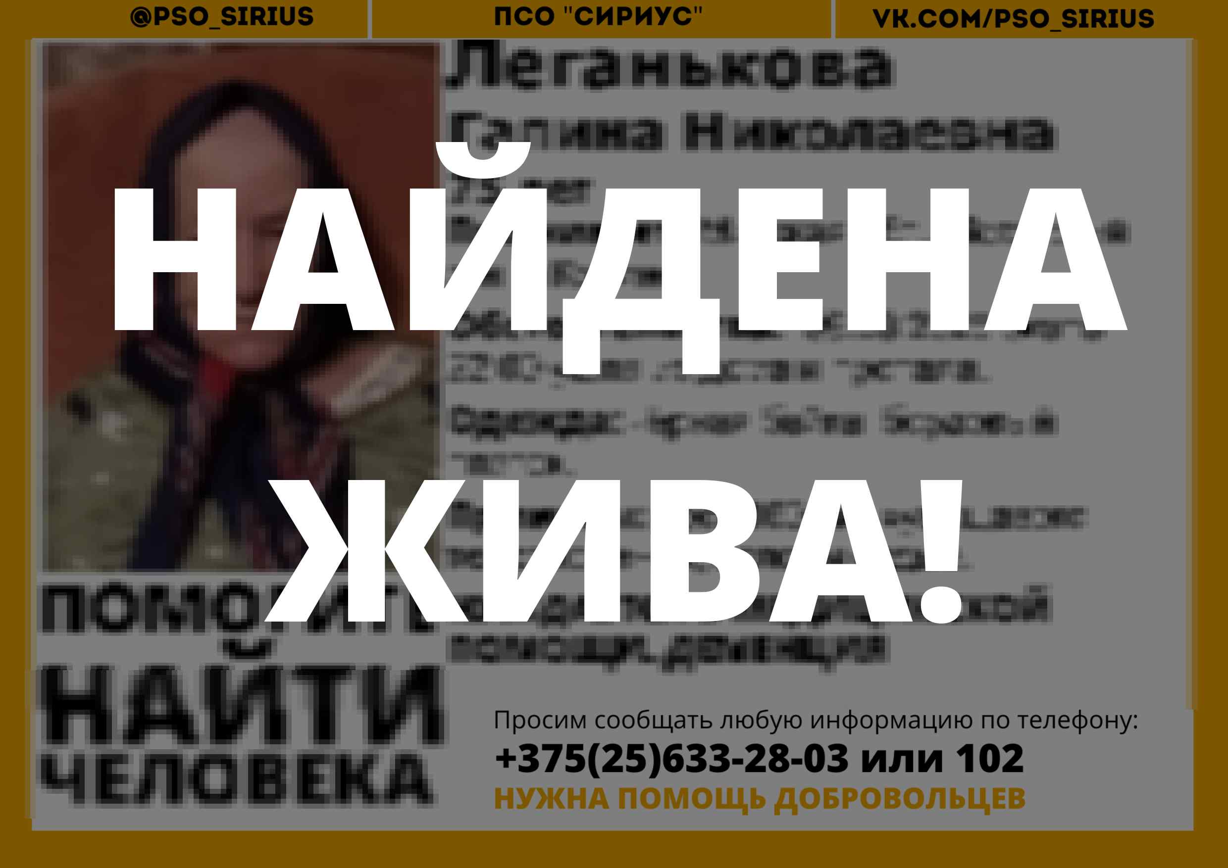 Всех, кто владеет информацией, просим сообщить: ПСО "Сириус" +375(25)633-28-03 |