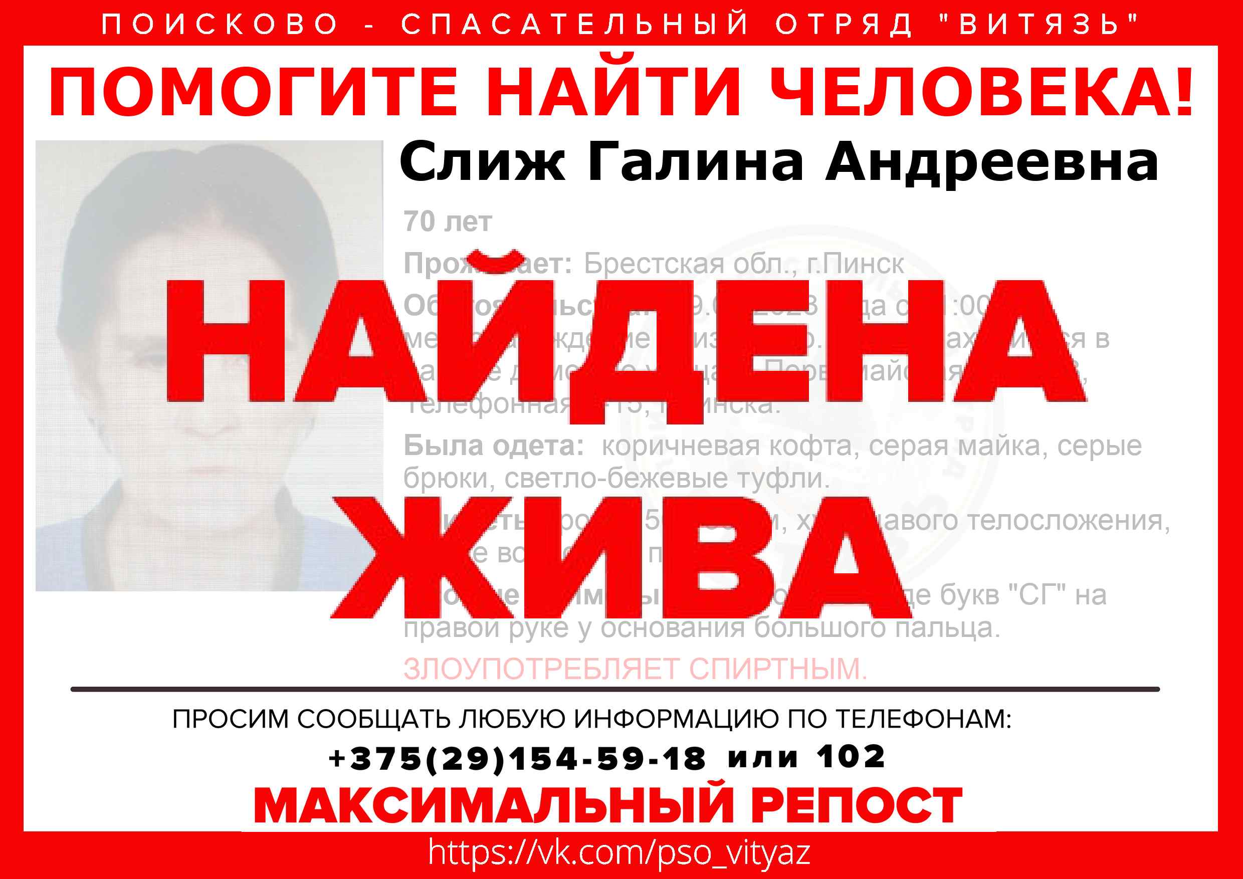 Всех, кто владеет информацией, просим сообщить: ПСО "ВИТЯЗЬ" +375(29)154-59-18 |