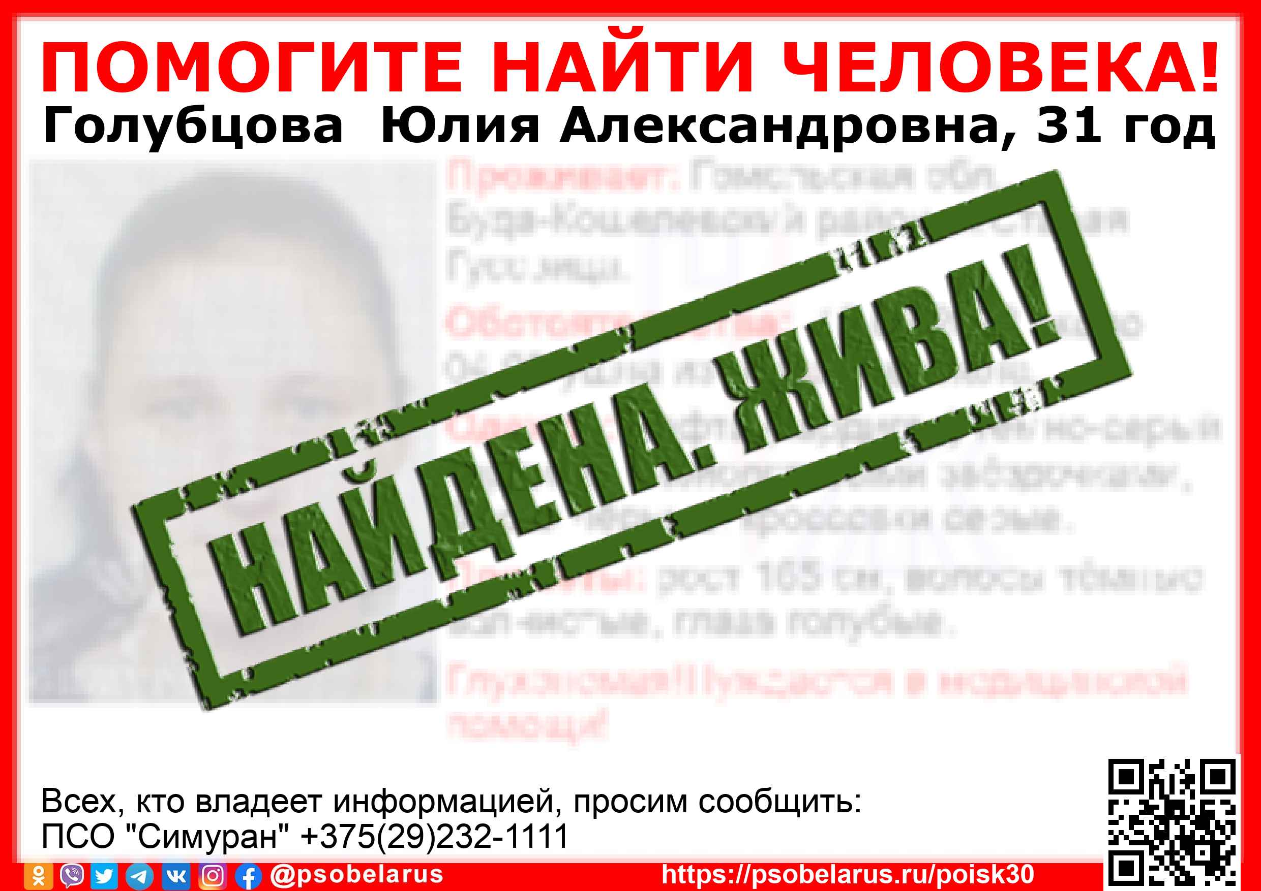 Всех, кто владеет информацией, просим сообщить: ПСО "Симуран" +375(29)232-1111 |