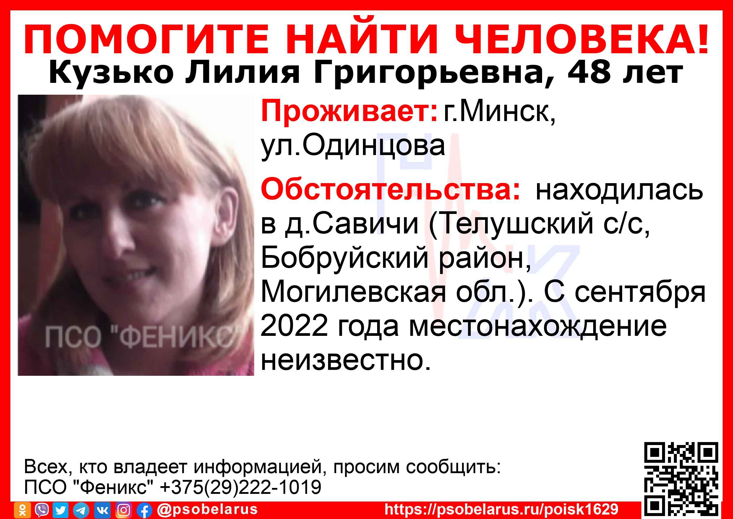 Всех, кто владеет информацией, просим сообщить: ПСО "Феникс" +375(29)222-1019 |