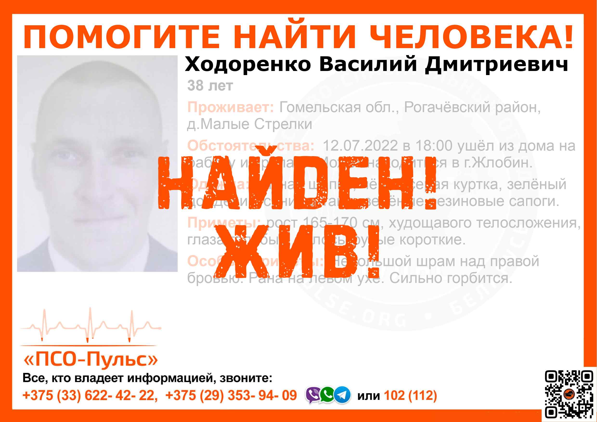 Всех, кто владеет информацией, просим сообщить: ПСО "ПСО-Пульс" +375(33)622-4222 |