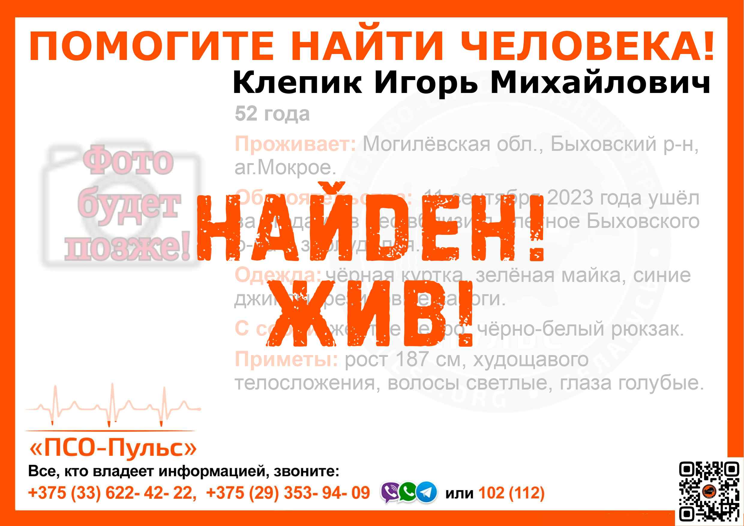 Всех, кто владеет информацией, просим сообщить: ПСО "ПСО-Пульс" +375(33)622-4222 |