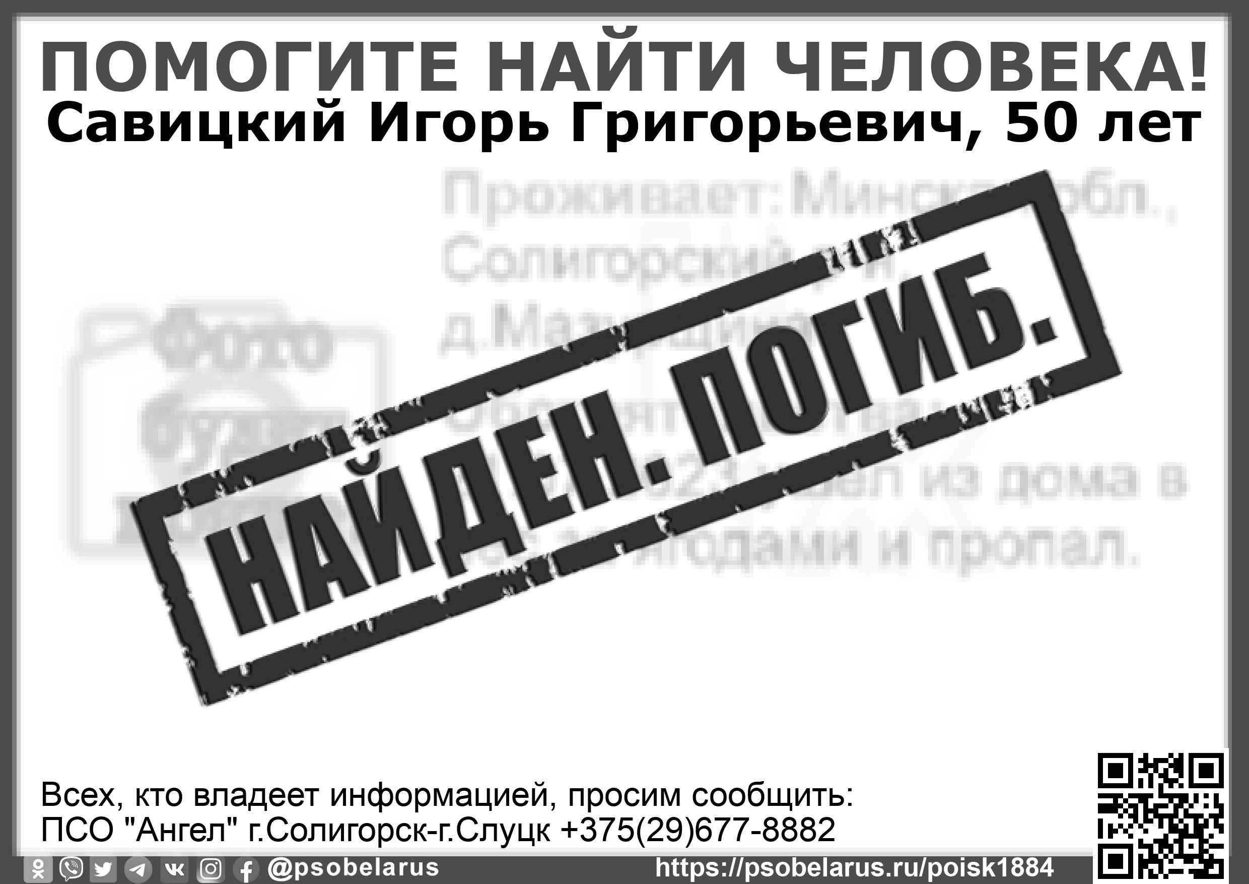 Всех, кто владеет информацией, просим сообщить: ПСО "Ангел" г.Солигорск-г.Слуцк +375(29)677-8882 |
