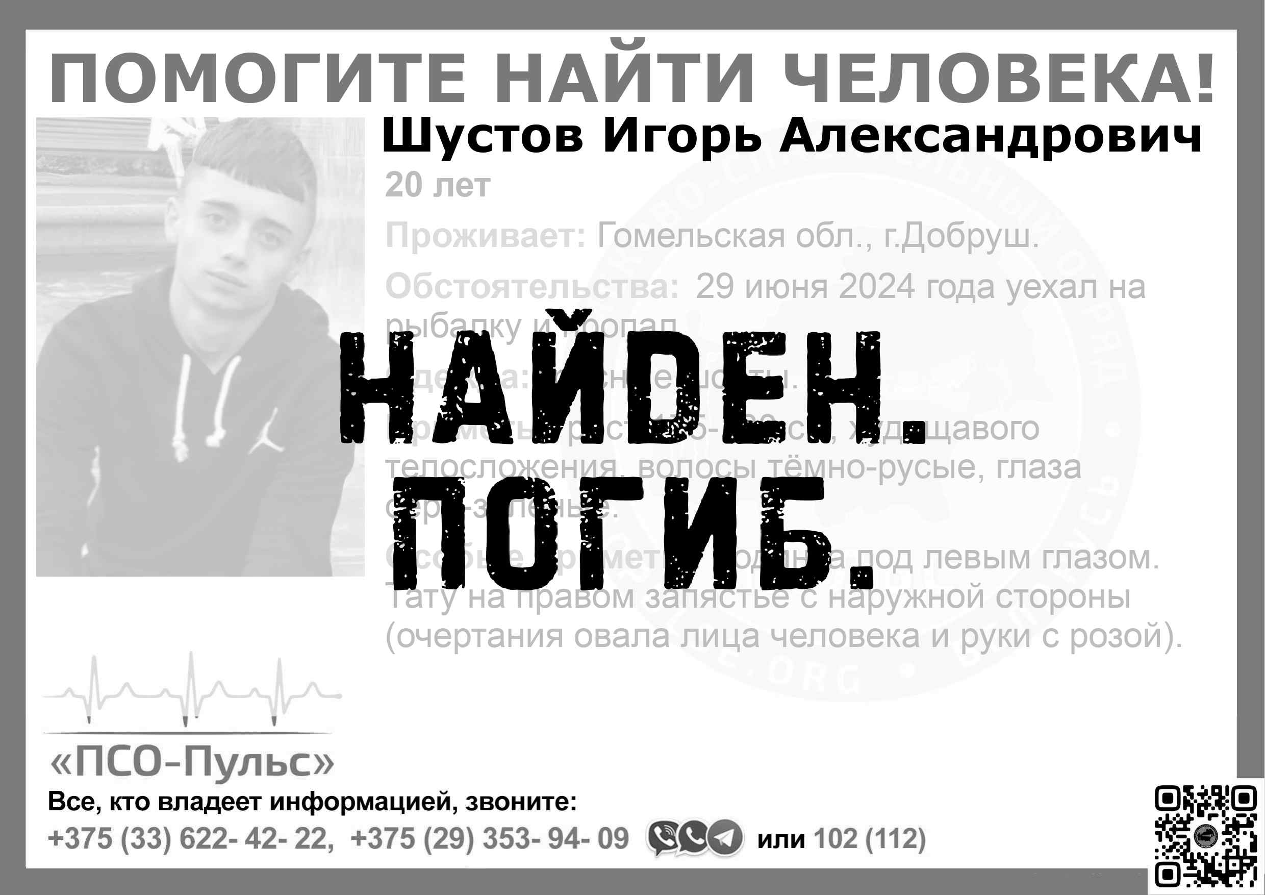 Всех, кто владеет информацией, просим сообщить: ПСО "ПСО-Пульс" +375(33)622-4222 |