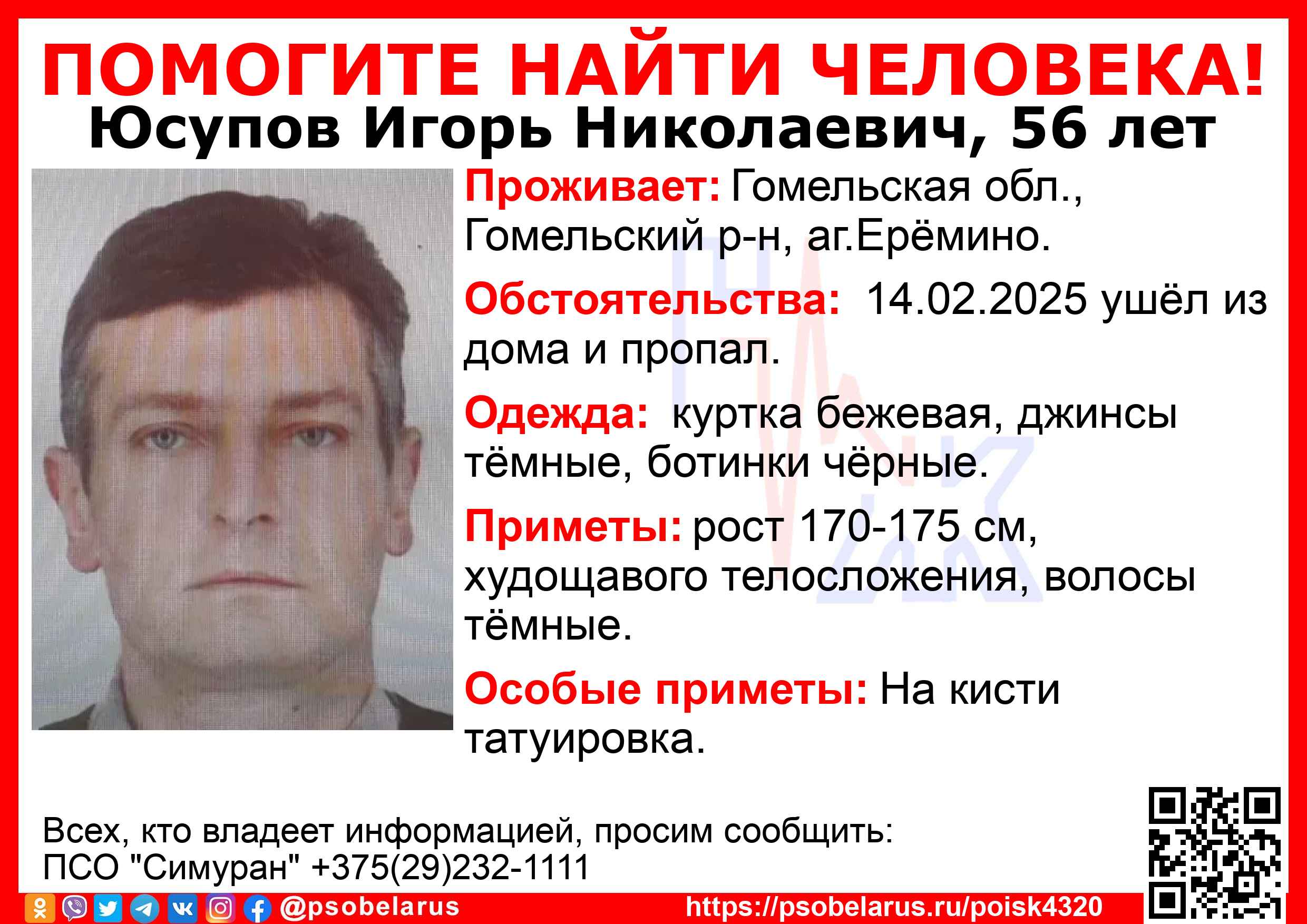 Всех, кто владеет информацией, просим сообщить: ПСО "Симуран" +375(29)232-1111 |