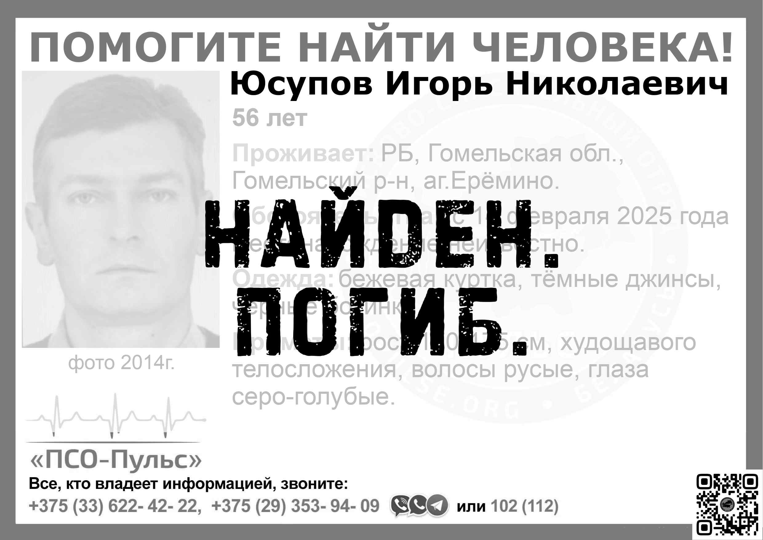 Всех, кто владеет информацией, просим сообщить: ПСО "ПСО-Пульс" +375(33)622-4222 |