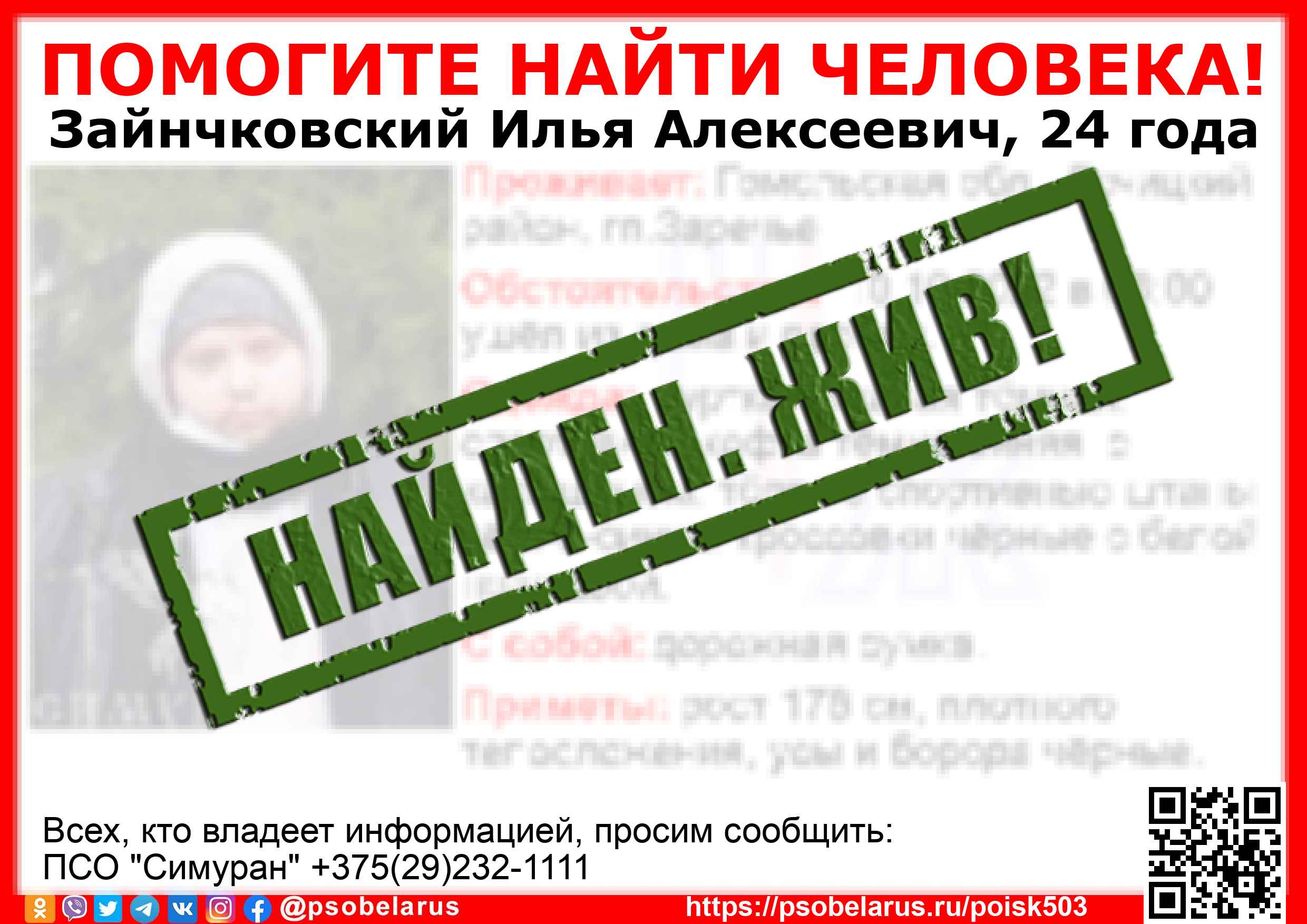 | Всех, кто владеет информацией, просим сообщить: ПСО "Симуран" +375(29)232-1111 |  |