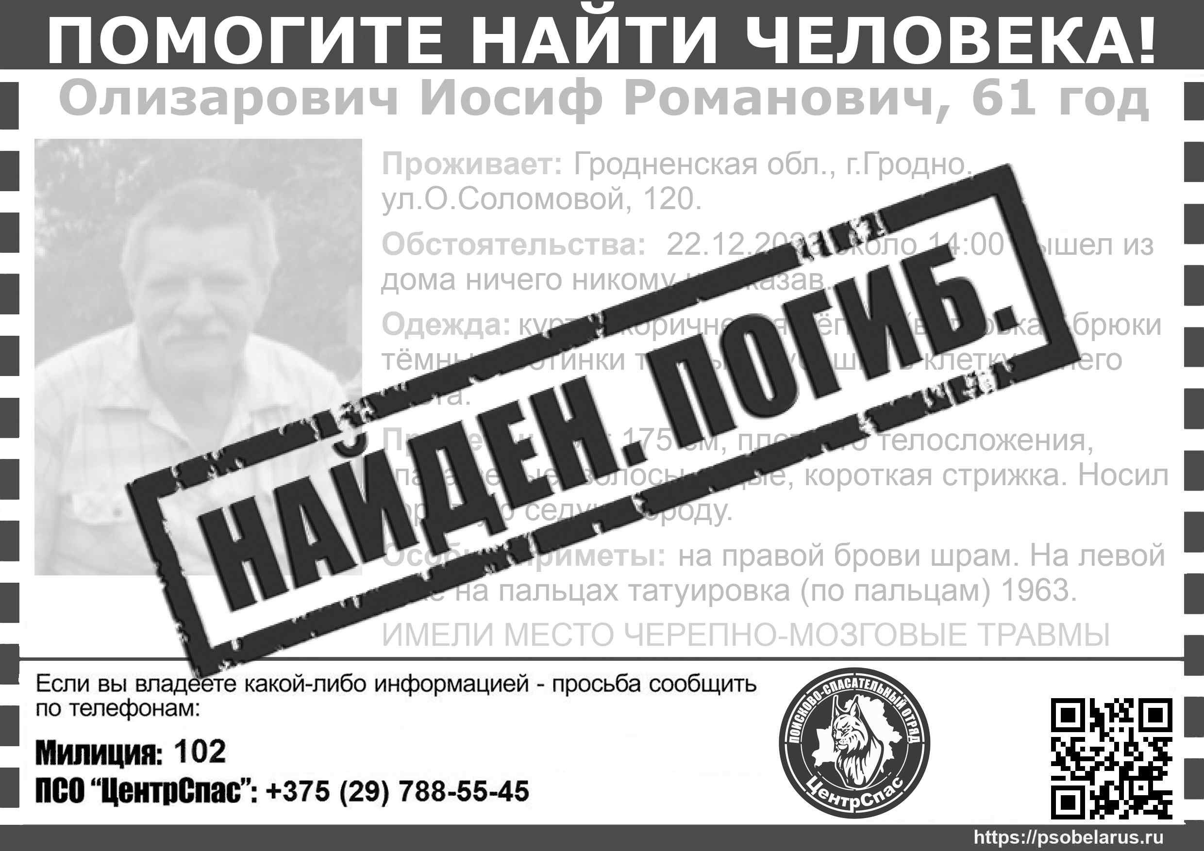 Всех, кто владеет информацией, просим сообщить: ПСО "ЦентрСпас" +375(29)788-5545 |