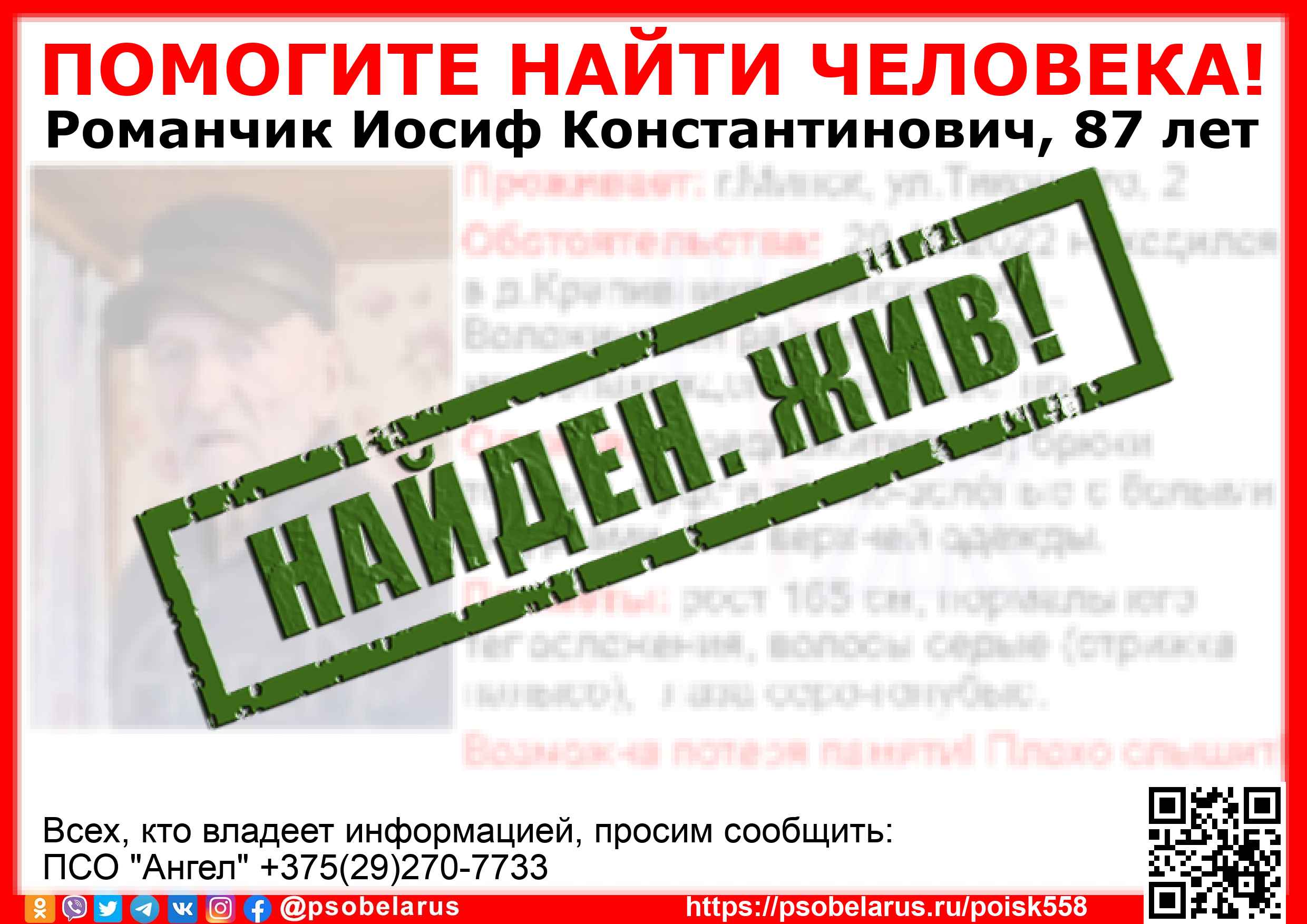 Всех, кто владеет информацией, просим сообщить: ПСО "Ангел" +375(29)270-7733 |