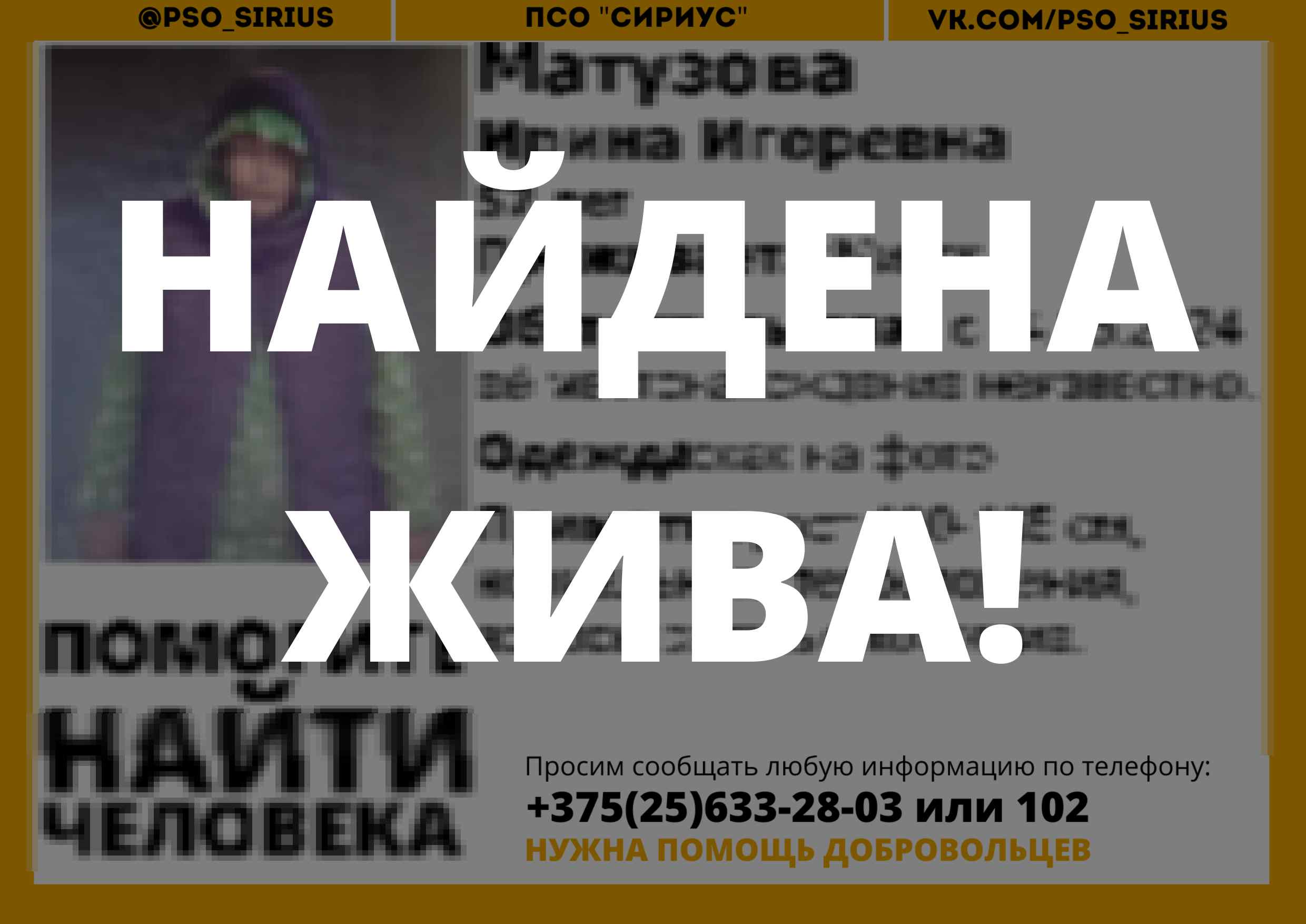Всех, кто владеет информацией, просим сообщить: ПСО "Сириус" +375(25)633-28-03 |