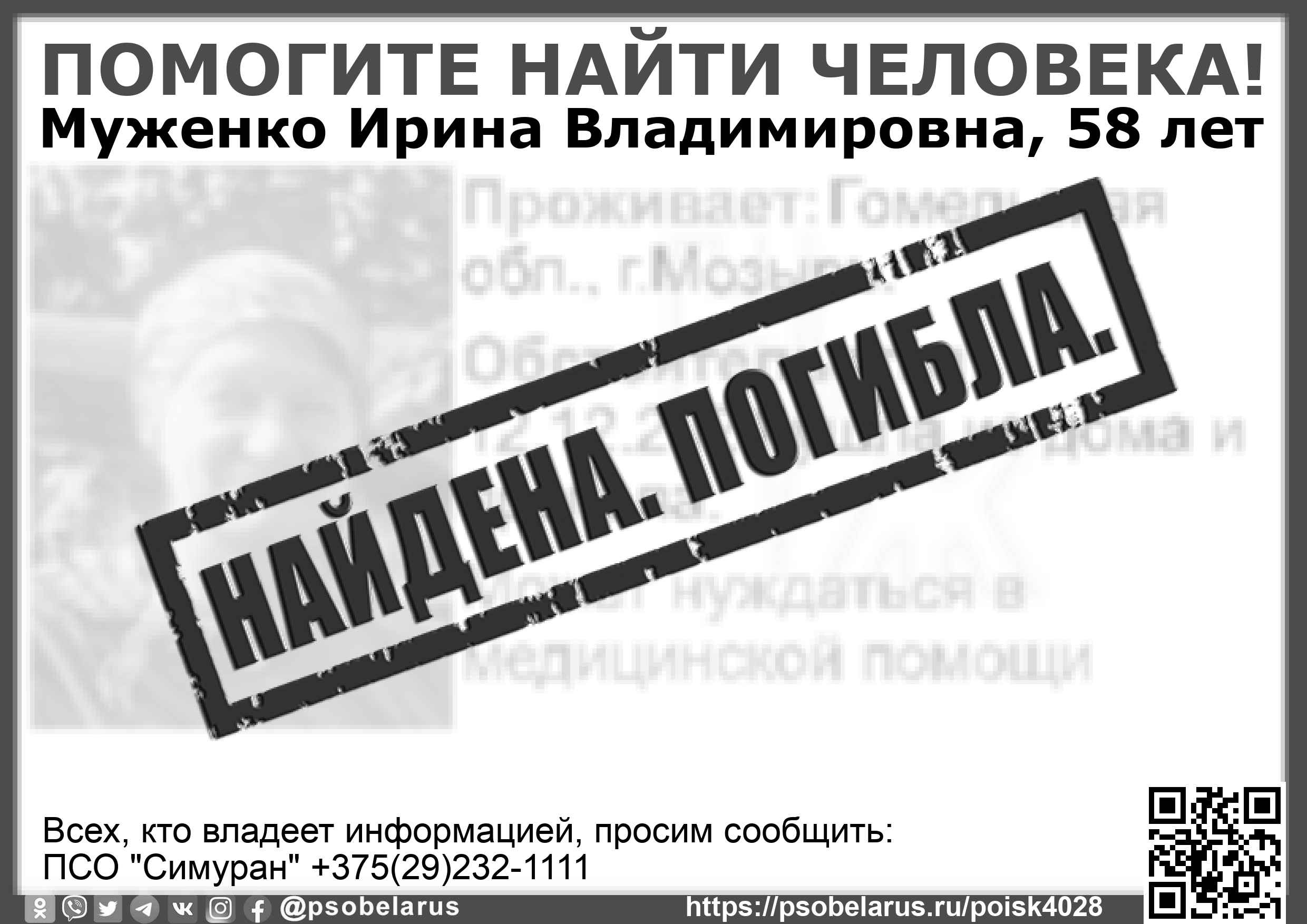 | Всех, кто владеет информацией, просим сообщить: ПСО "Симуран" +375(29)232-1111 |  |