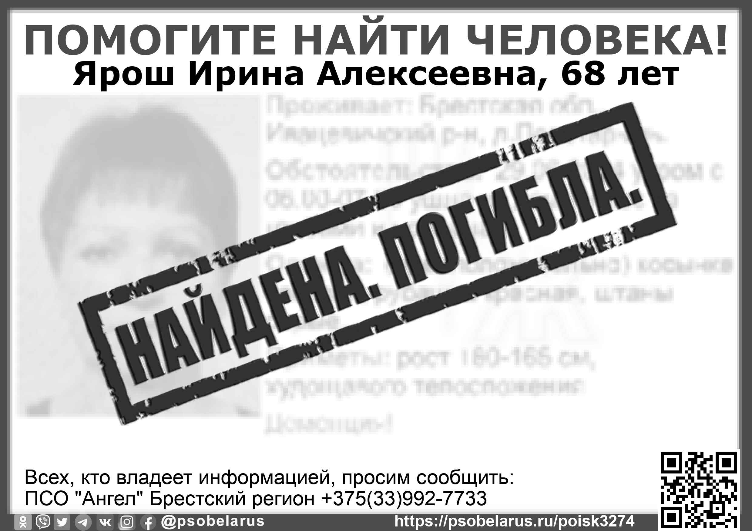 Всех, кто владеет информацией, просим сообщить: ПСО "Ангел" Брестский регион +375(33)992-7733 |