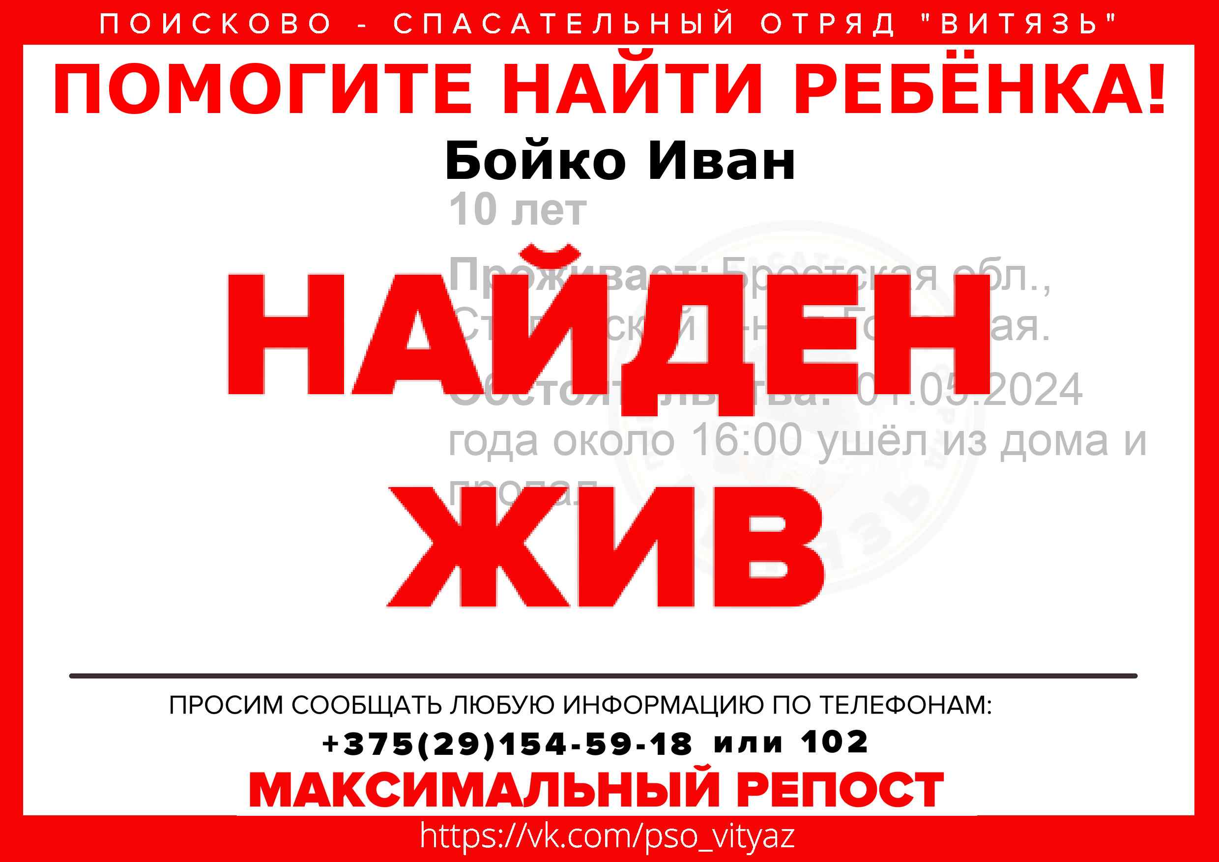Всех, кто владеет информацией, просим сообщить: ПСО "ВИТЯЗЬ" +375(29)154-59-18 |