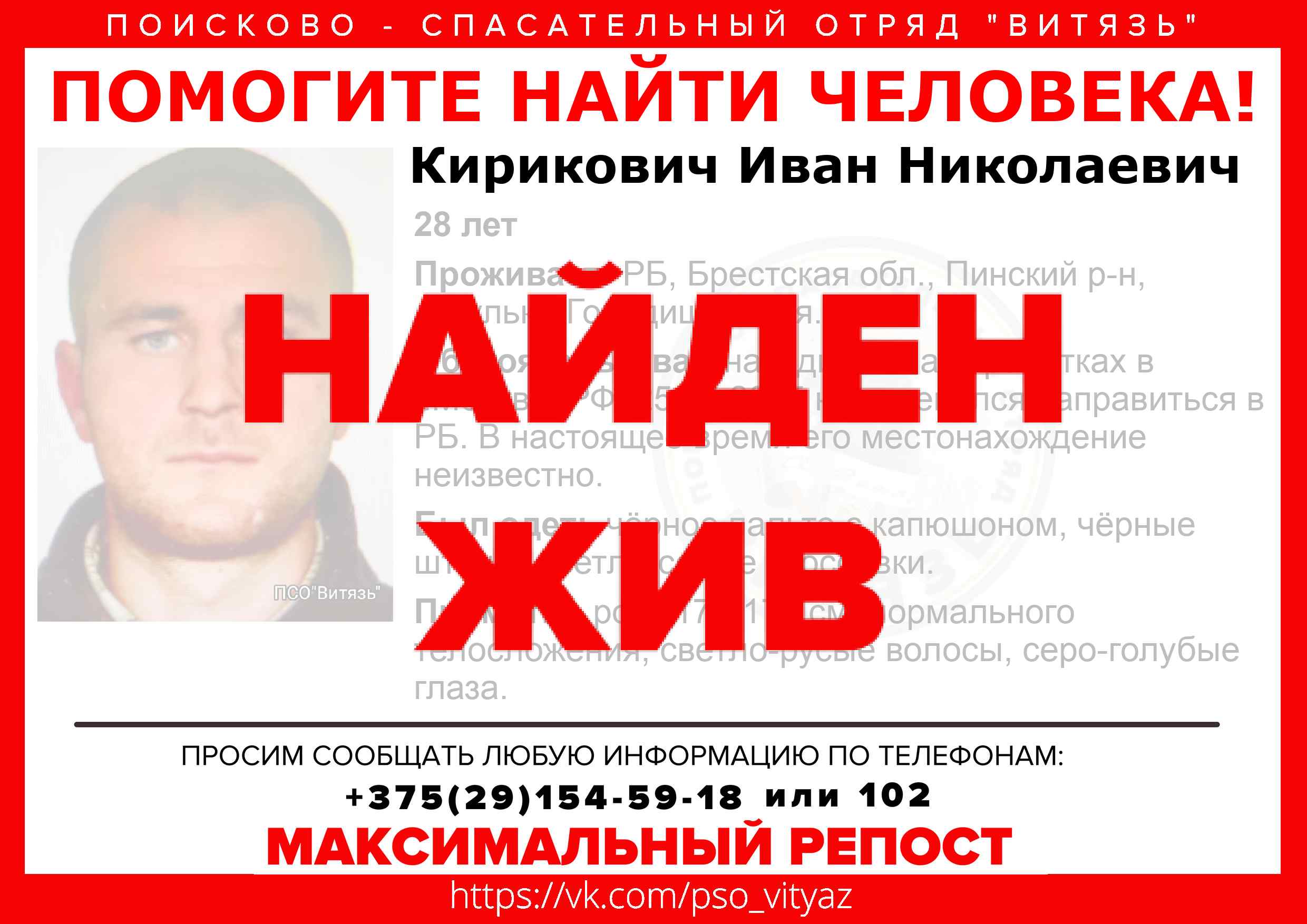 Всех, кто владеет информацией, просим сообщить: ПСО "ВИТЯЗЬ" +375(29)154-59-18 |
