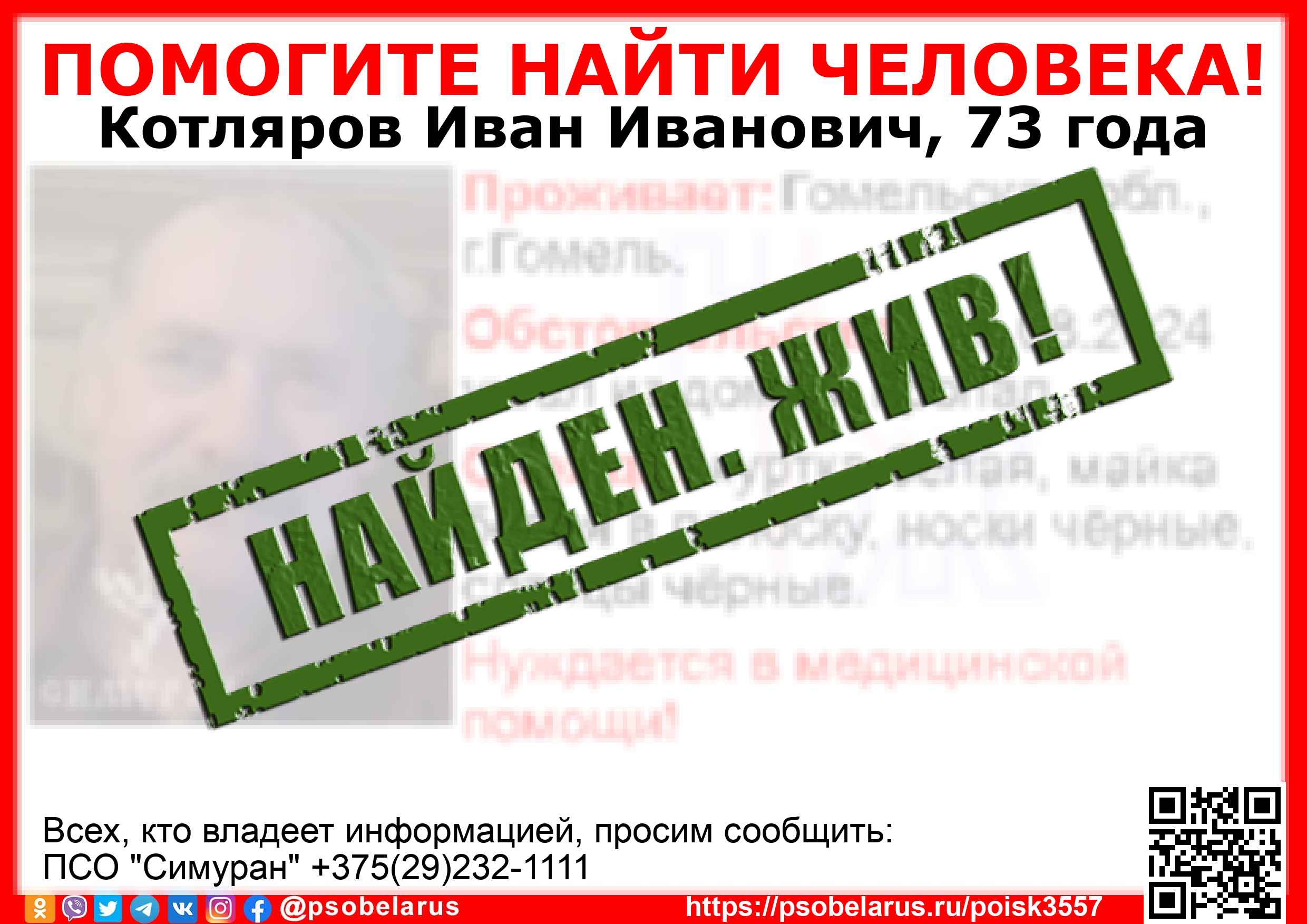 Всех, кто владеет информацией, просим сообщить: ПСО "Симуран" +375(29)232-1111 |