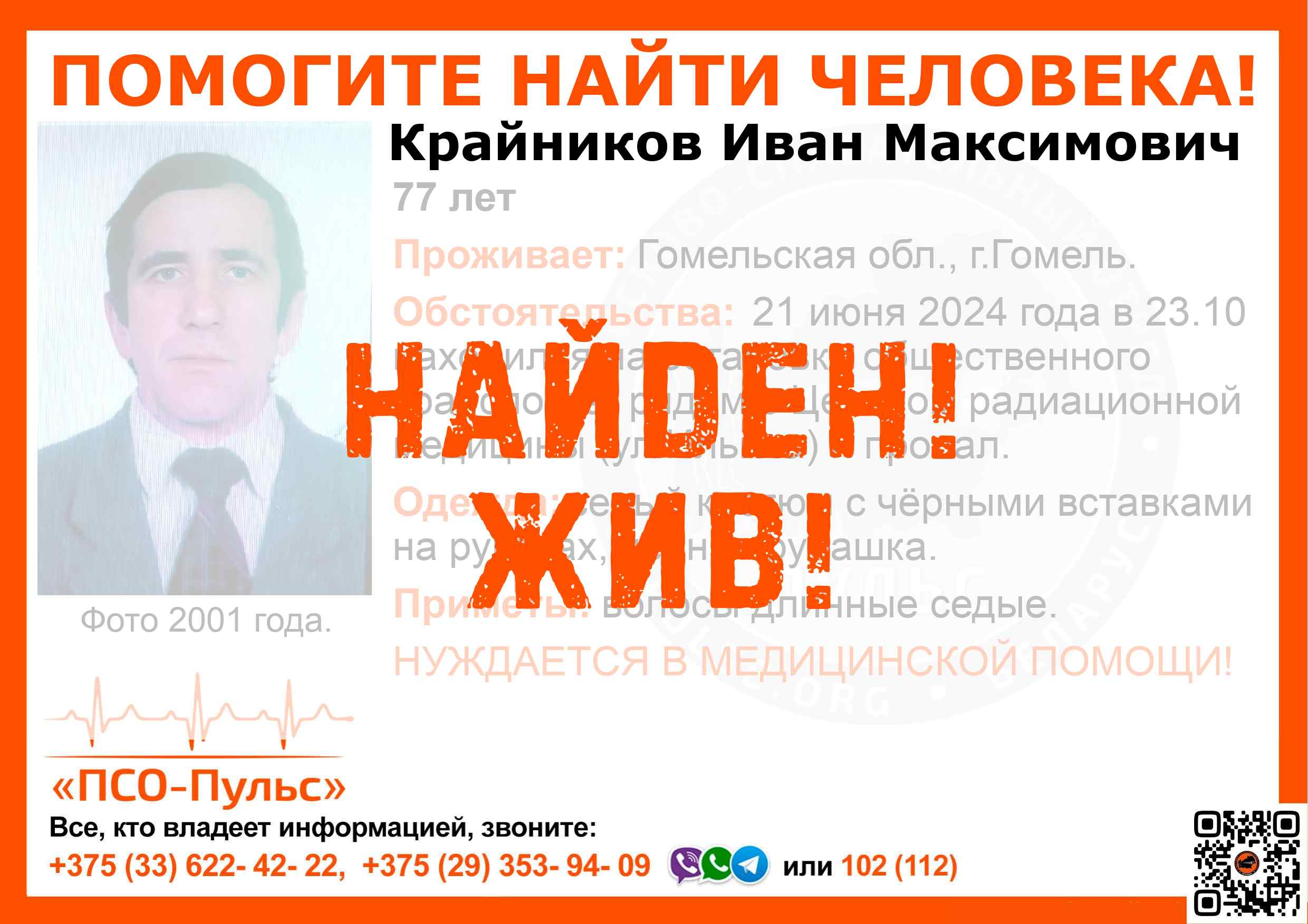 Всех, кто владеет информацией, просим сообщить: ПСО "ПСО-Пульс" +375(33)622-4222 |