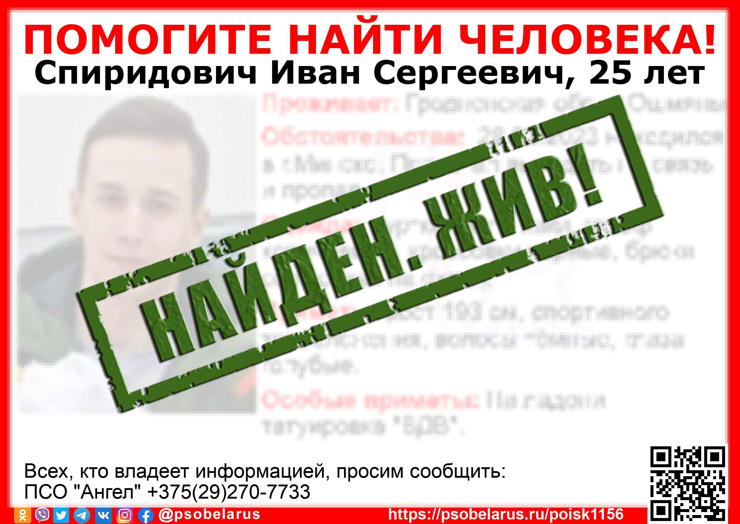 Всех, кто владеет информацией, просим сообщить: ПСО "Ангел" +375(29)270-7733 |