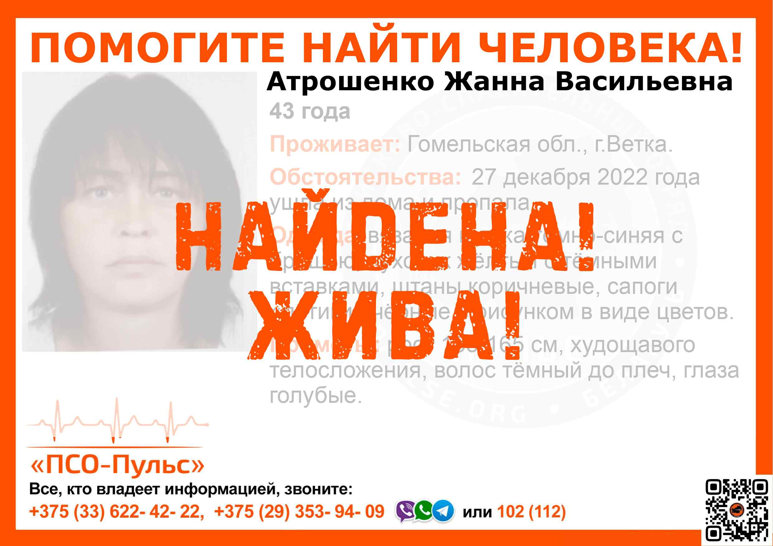 Скачать ориентировкуДля оперативного получения информации о пропавших людях и сборах на поиски можно подписаться на бота оповещения: Телеграм