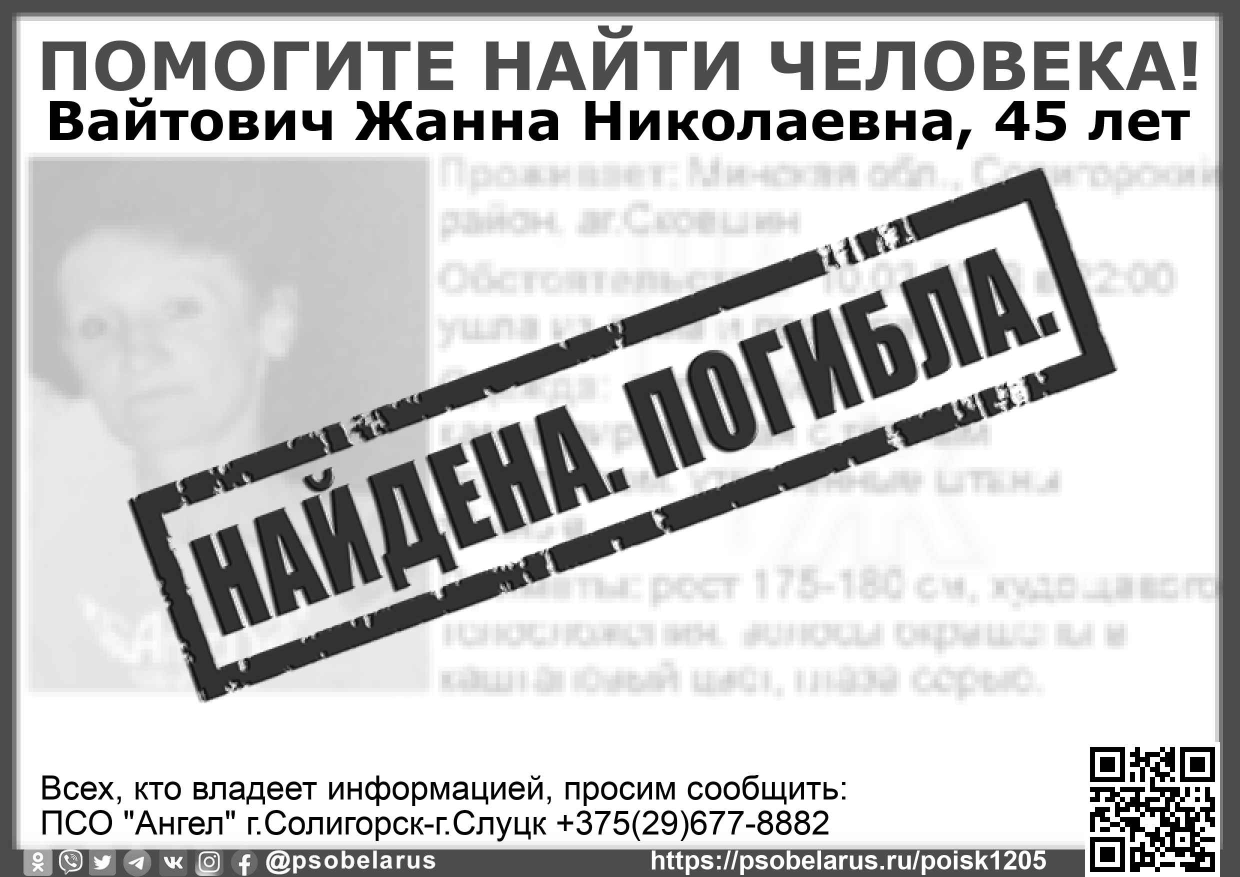 Всех, кто владеет информацией, просим сообщить: ПСО "Ангел" г.Солигорск-г.Слуцк +375(29)677-8882 |