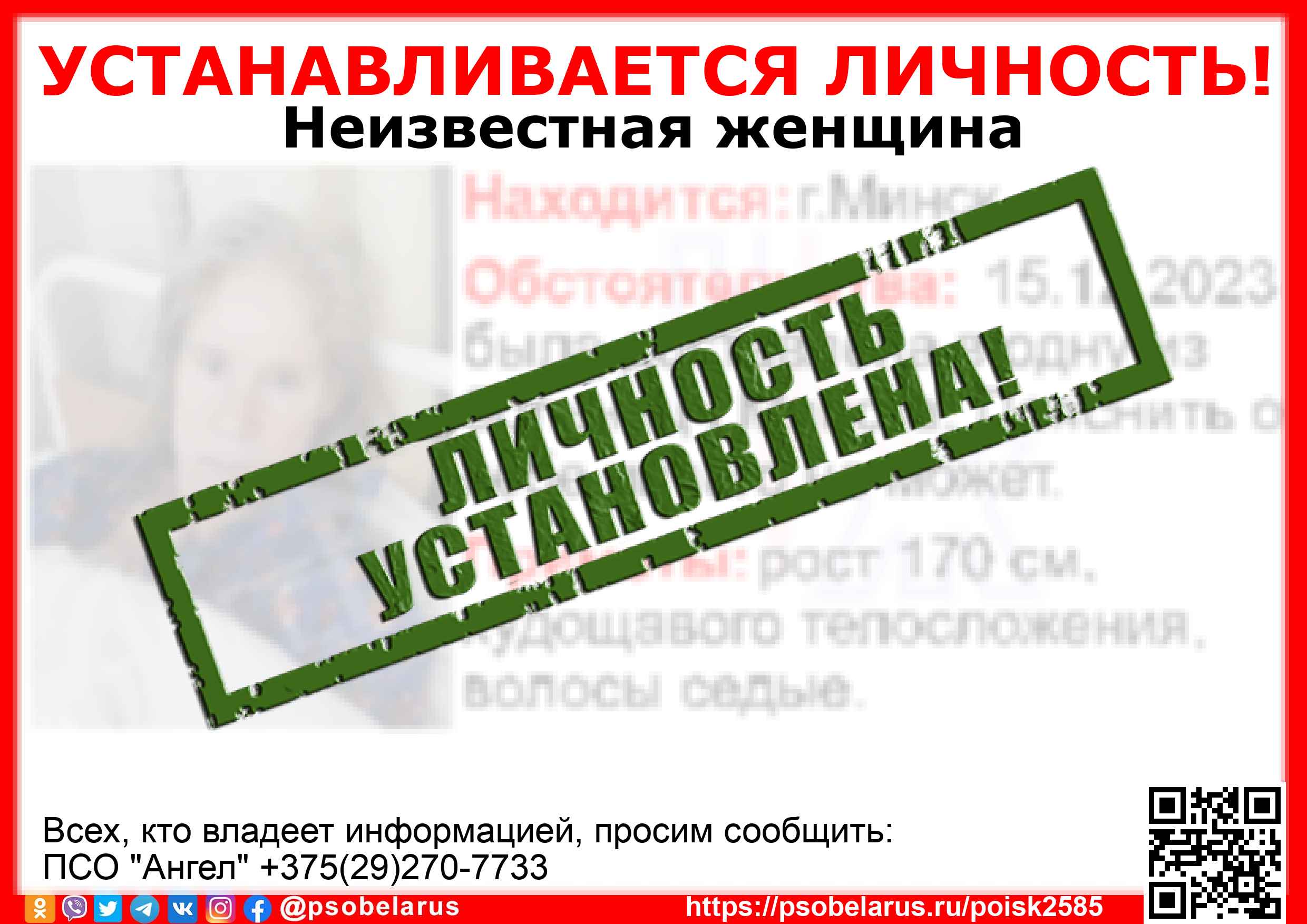 Всех, кто владеет информацией, просим сообщить: ПСО "Ангел" +375(29)270-7733 |