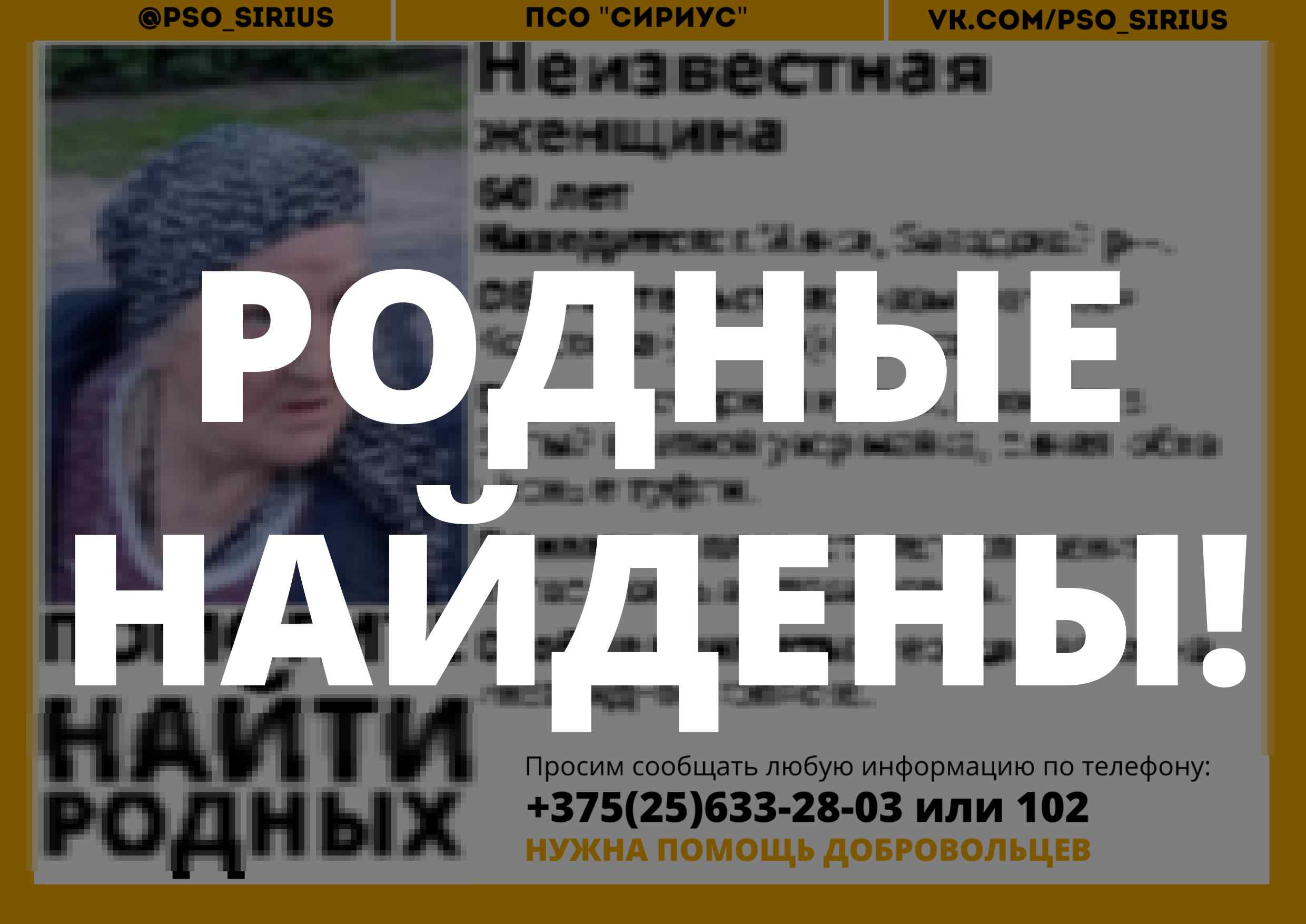 Всех, кто владеет информацией, просим сообщить: ПСО "Сириус" +375(25)633-28-03 |