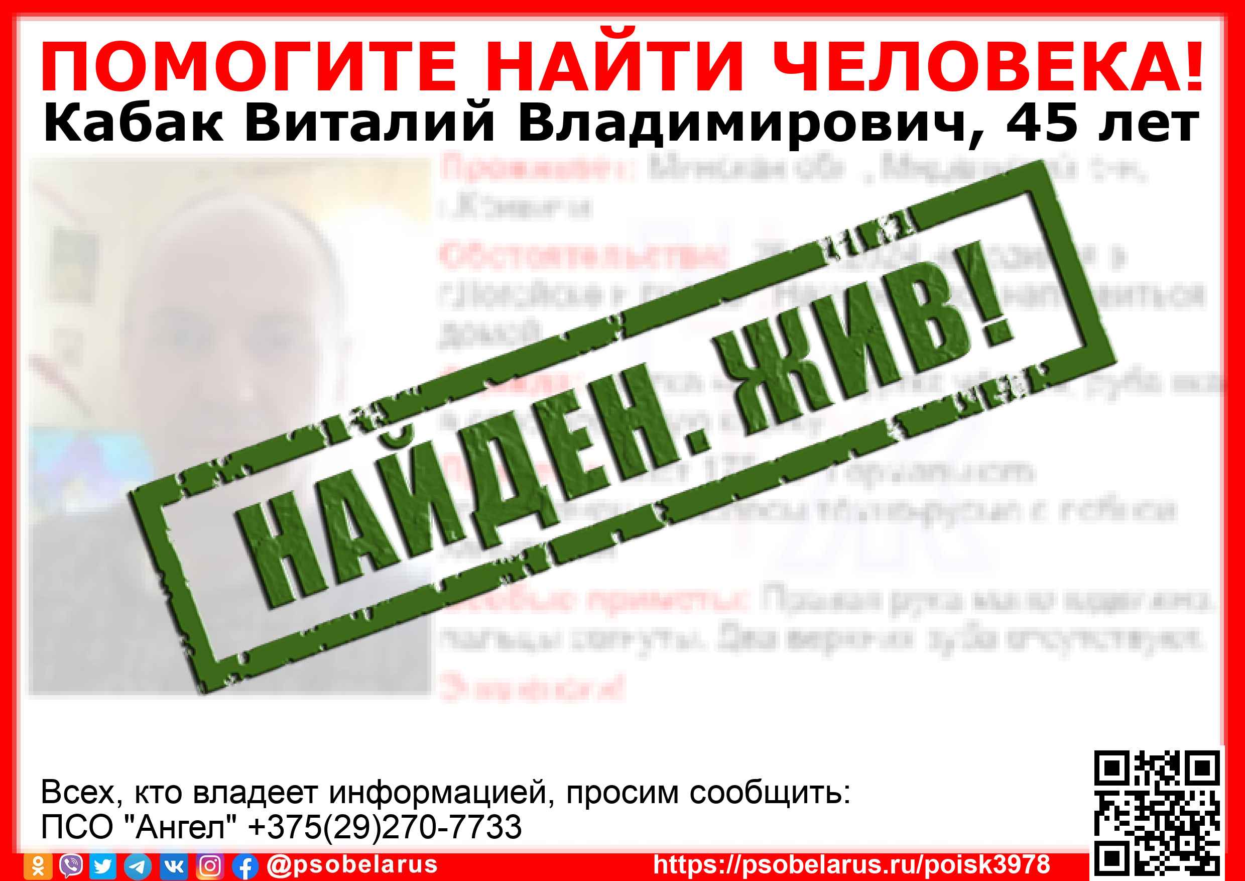 Всех, кто владеет информацией, просим сообщить: ПСО "Ангел" +375(29)270-7733 |