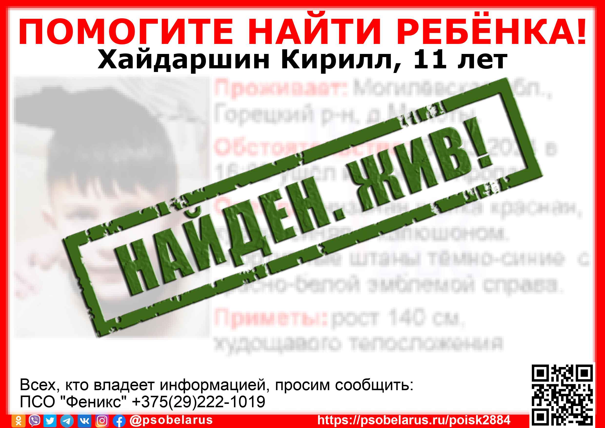 Всех, кто владеет информацией, просим сообщить: ПСО "Феникс" +375(29)222-1019 |