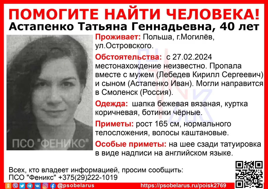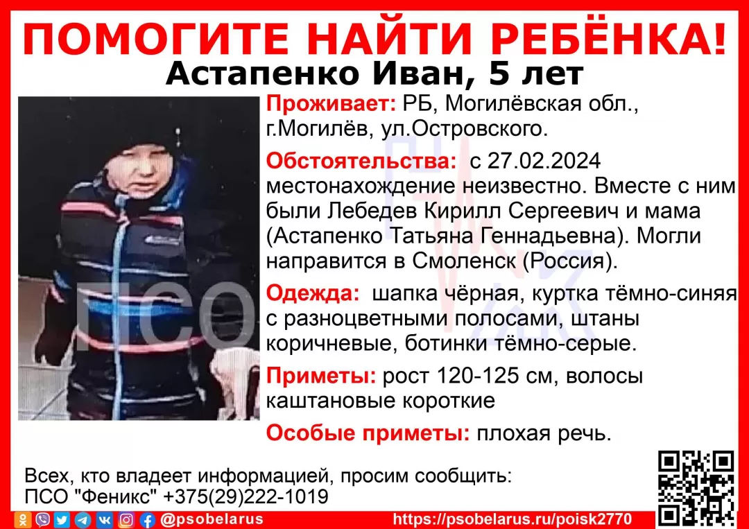 с 27.02.2024 местонахождение неизвестно. Пропал вместе с Астапенко Татьяной Геннадьевной и Астапенко Иваном. Могли направится в Смоленск (Россия).